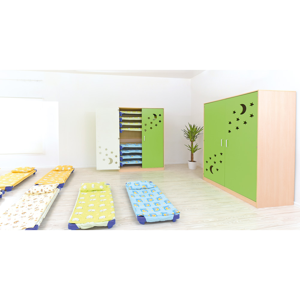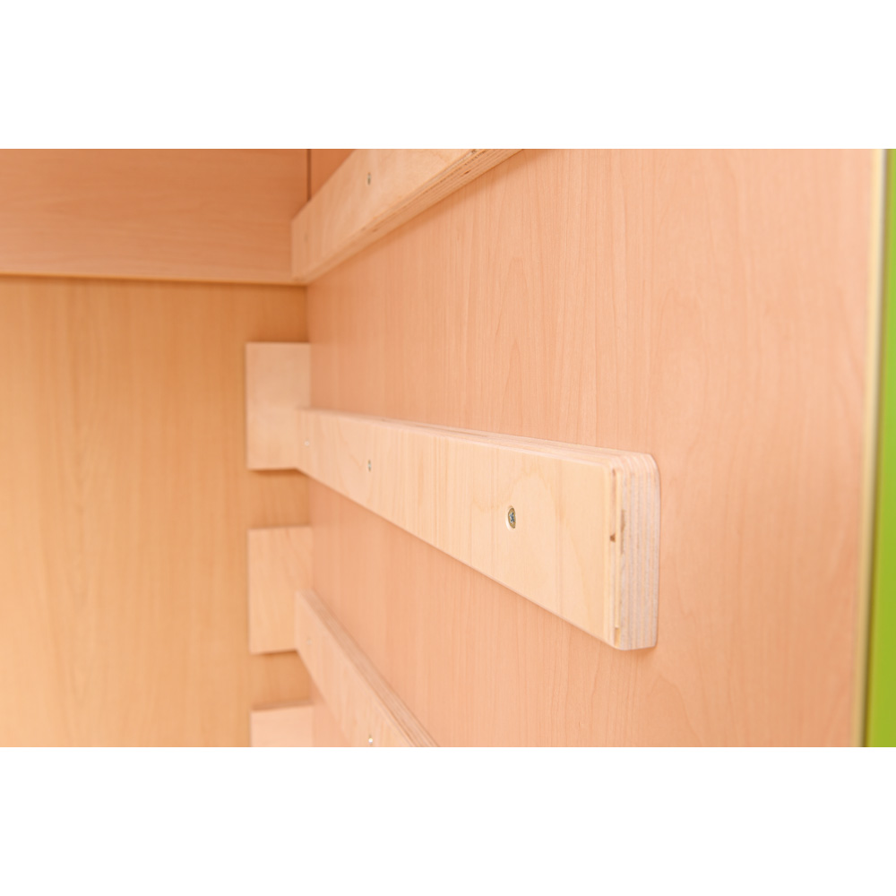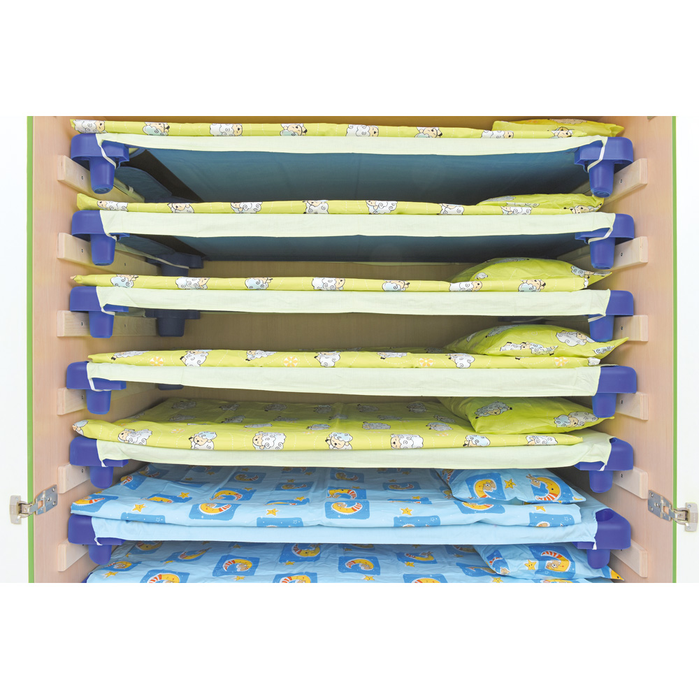 Spinta skirta laikyti iki 10 vaikiškų lovyčių (501001, 501013, 092810, matmenys 132,5 x 59 x 12 cm, parduodamos atskirai). Tarpai tarp lovyčių vietų leidžia laikyti lovytes kartu su patalyne. Durelėse esančios angos palengvina vėdinimą. Dėl vyrių spintos duris galima atidaryti 180 laipsnių kampu (įdėti vaikiškas lovytes galima tik tada, kai durys visiškai atidarytos). Pagaminta iš 18 mm storio laminuotos beržo atspalvių plokštės. Durys pagamintos iš laminuotos MDF plokštės. Kad spinta būtų stabilesnė, ją reikia pritvirtinti prie sienos. Tvirtinimo komponentai įtraukti į komplektą.