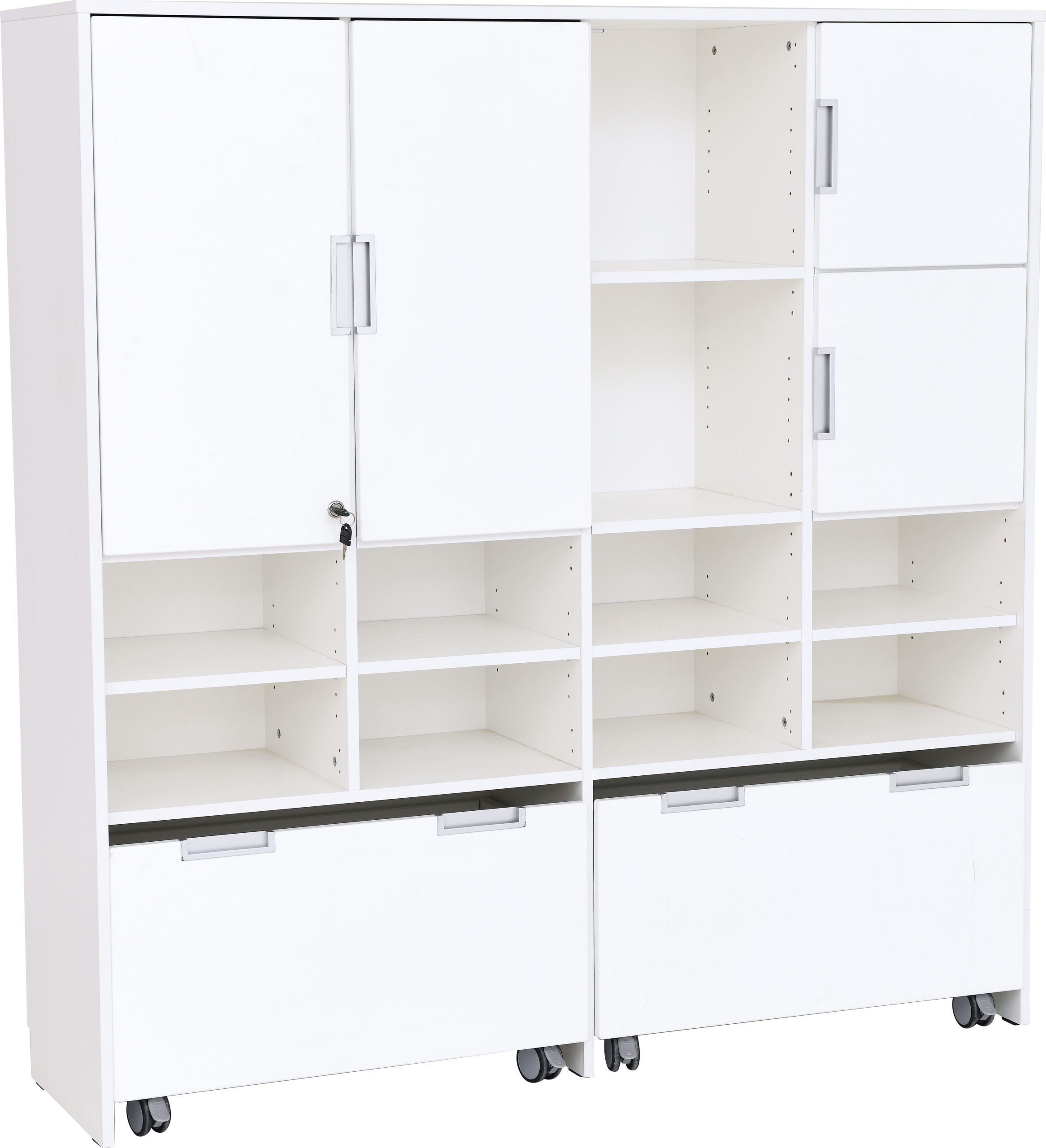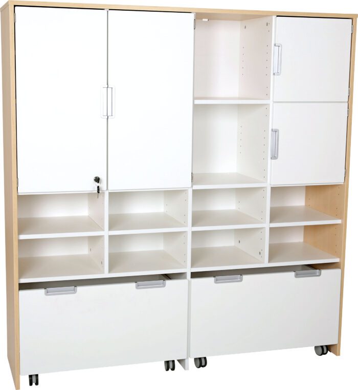 Baldai pagaminti iš baltos arba klevo laminuotos 18 mm storio plokštės, 18 mm storio frontai padengti patvaria termoplastine fanera.
