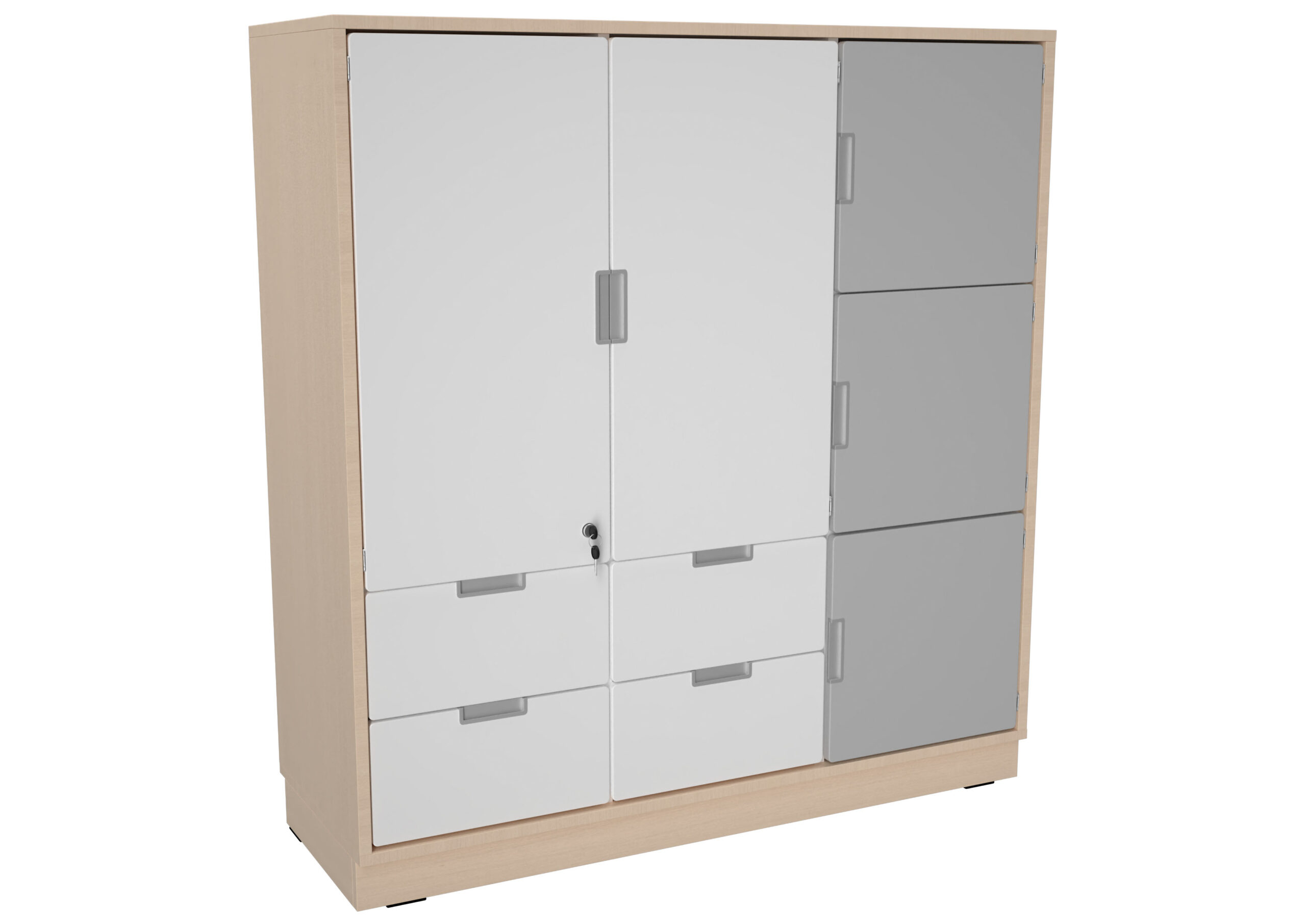 Baldai pagaminti iš 18 mm storio laminuotos klevo ir baltos spalvos plokštės, 18 mm storio priekinės dalys padengtos patvaria termoplastine fanera.