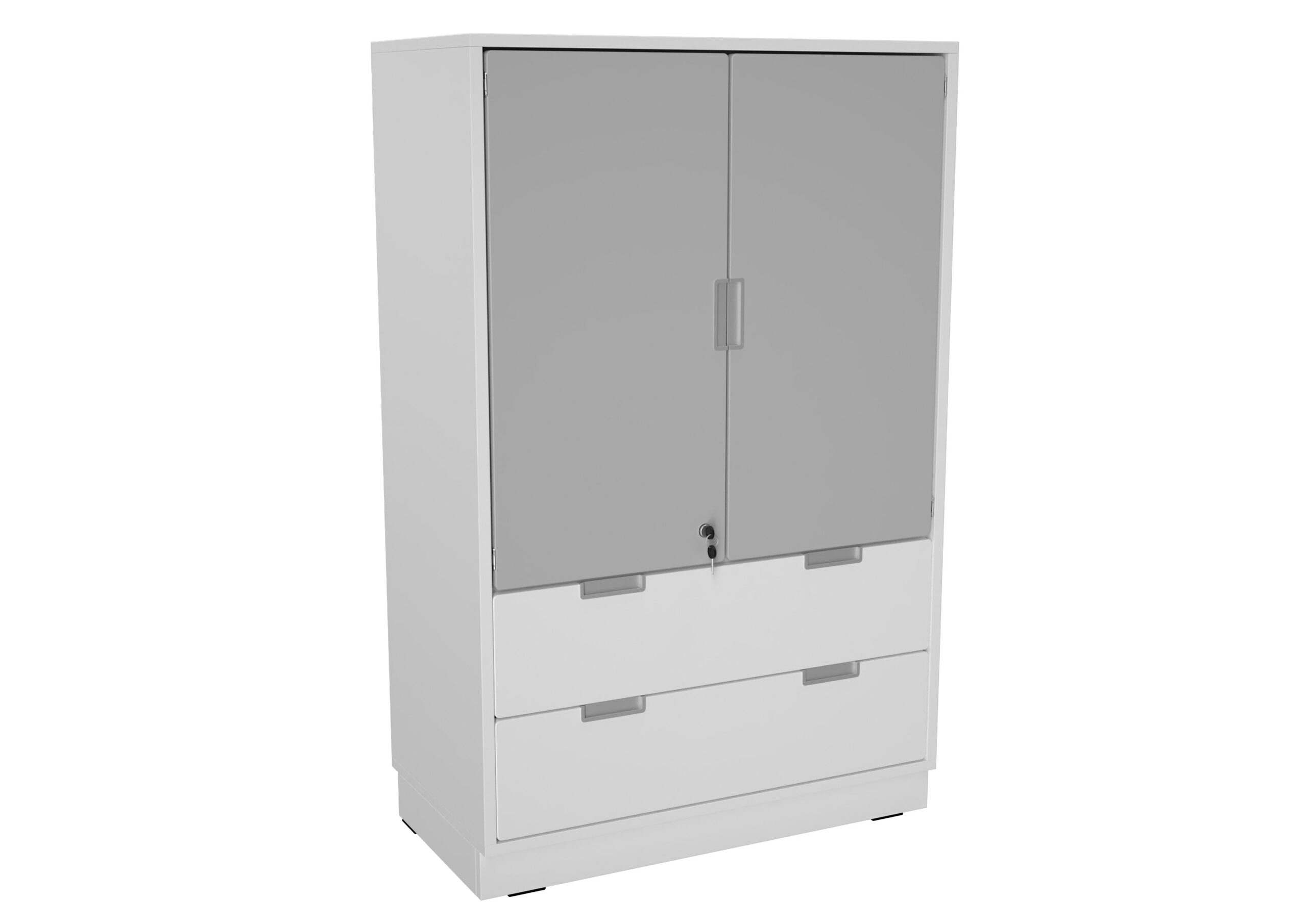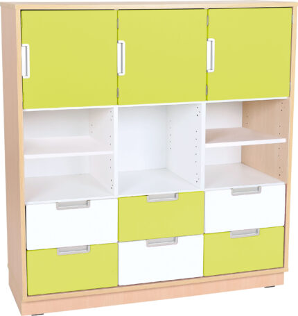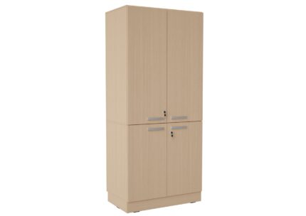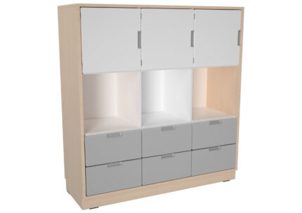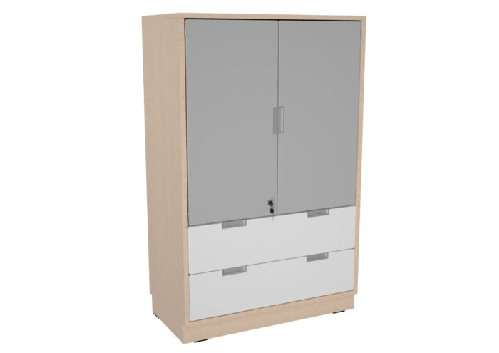 Baldai pagaminti iš 18 mm storio laminuotos klevo ir baltos spalvos plokštės, 18 mm storio priekinės dalys padengtos patvaria termoplastine fanera.