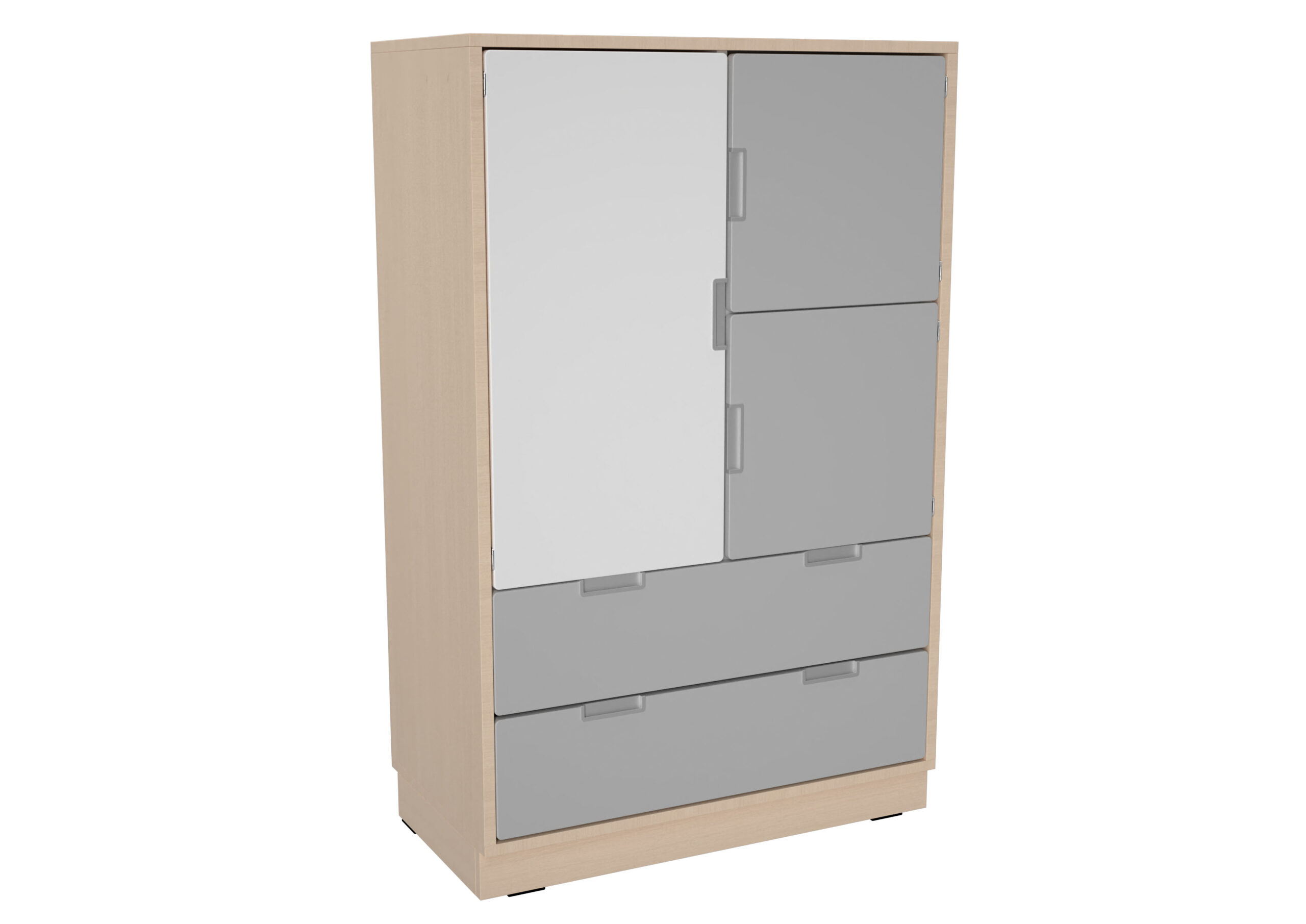 Baldai pagaminti iš 18 mm storio laminuotos klevo ir baltos spalvos plokštės, 18 mm storio priekinės dalys padengtos patvaria termoplastine fanera.