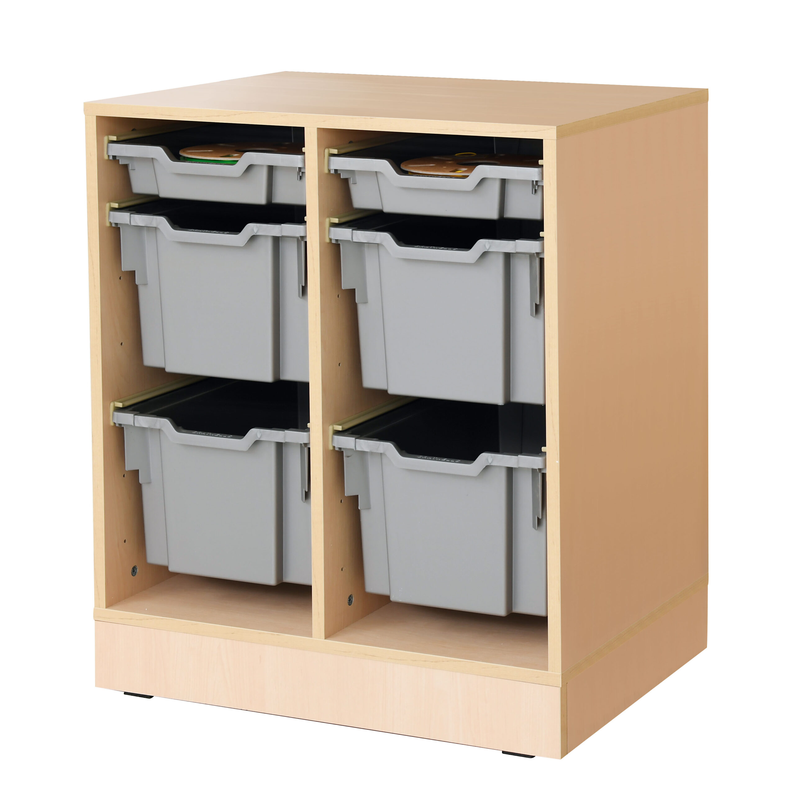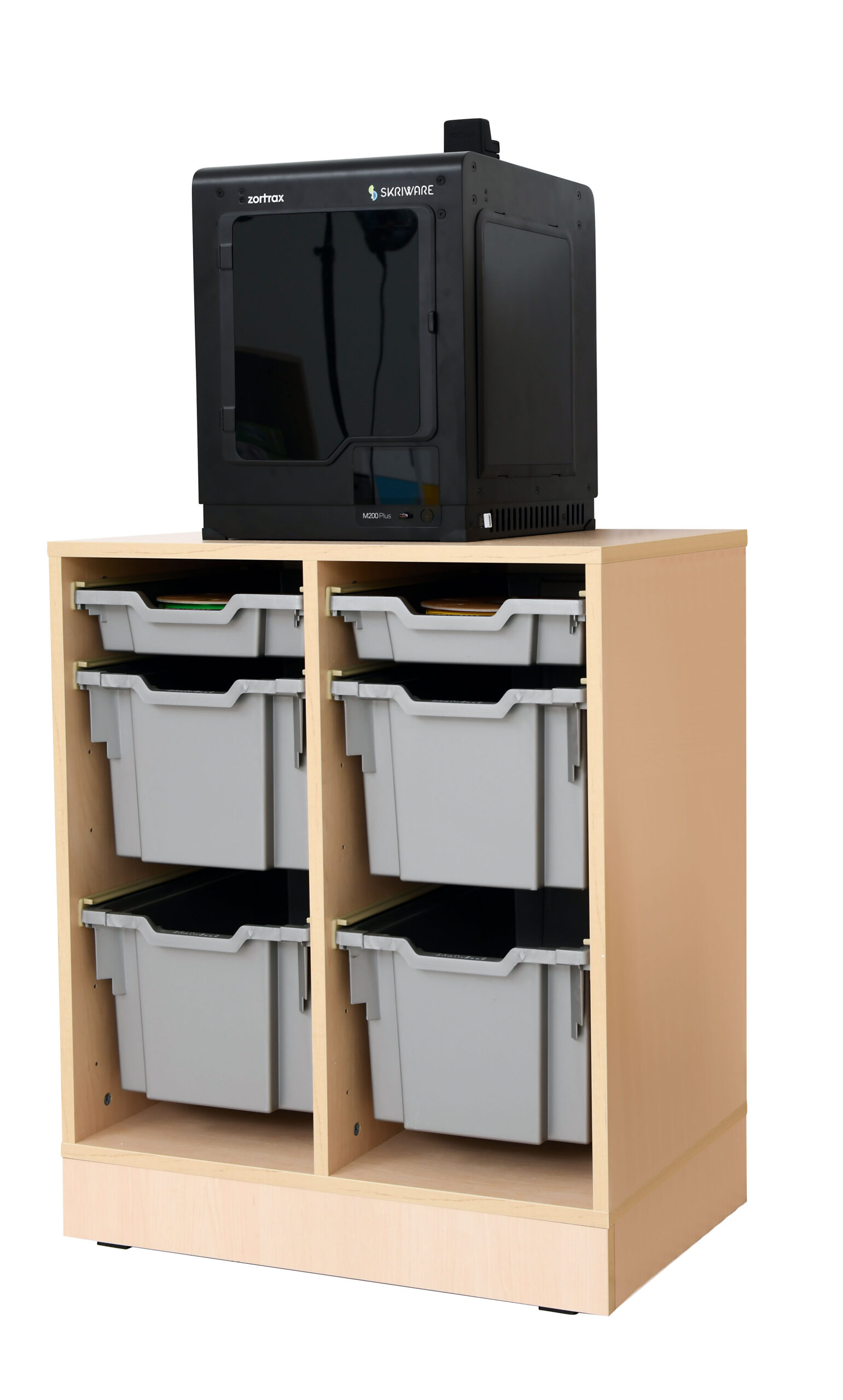 Baldai pagaminti iš 18 mm storio klevo spavos laminuotos plokštės. Į komplektą įeina dėžės.