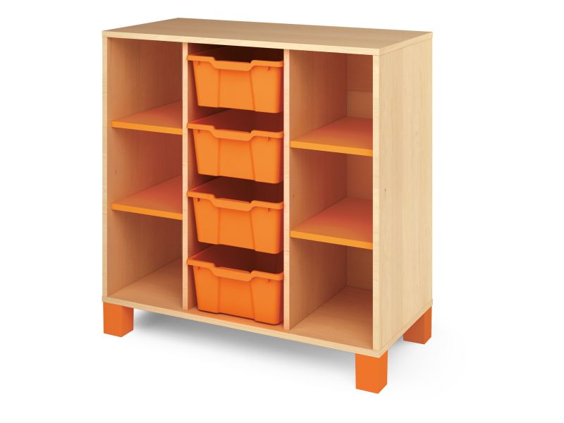 Matmenys 92 x 45 x 94 cm. Spintelės matmenys 92 x 45 x 94 cm. Joje yra 7 nišos. Tipas: laisvai pastatoma. Konstrukcija pagaminta iš 18 mm storio beržo spalvos medžio drožlių plokštės. Baldų komplektas ant kojelių. Spintelėje yra 4 lentynos, pagamintos iš 18 mm storio oranžinės spalvos medžio drožlių plokštės. 4 šiukšliadėžės, pagamintos iš oranžinės spalvos plastiko, 31 x 42 x 14,8 cm dydžio. 4 oranžinės spalvos 7 x 10 mm dydžio kojelės. Galima įsigyti papildomų priedų: durelių, ratukų.