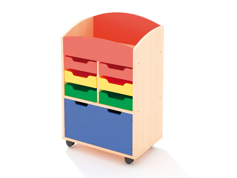 56,2 x 37,4 x 88,6 cm dydžio spinta. Tipas: kilnojamoji. Konstrukcija pagaminta iš 18 mm storio buko spalvos medžio drožlių plokštės. Baldų komplektas ant ratukų – 4 dalys. Spintelėje yra 1 lentyna, pagaminta iš 18 mm storio beržo spalvos medžio drožlių plokštės, dydis 52,4 x 33,8 cm. Spintelėje yra 1 stalčius, pagamintas iš medžio drožlių plokštės / MDF, dydis 52,2 x 38 x 35,4 cm. Priekinė dalis raudonos spalvos. 6 talpyklos, pagamintos iš spalvoto kartono, 35 x 25 x 8 cm dydžio.