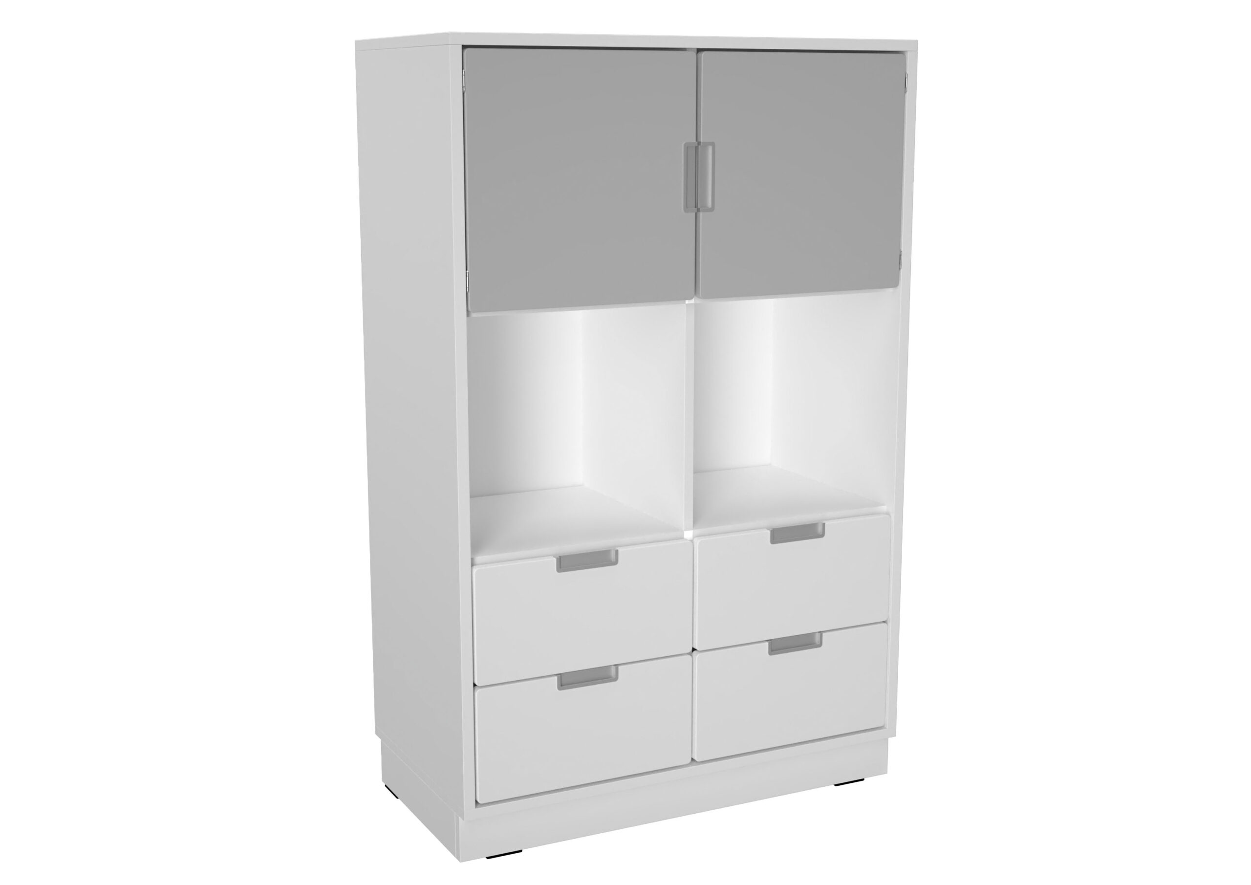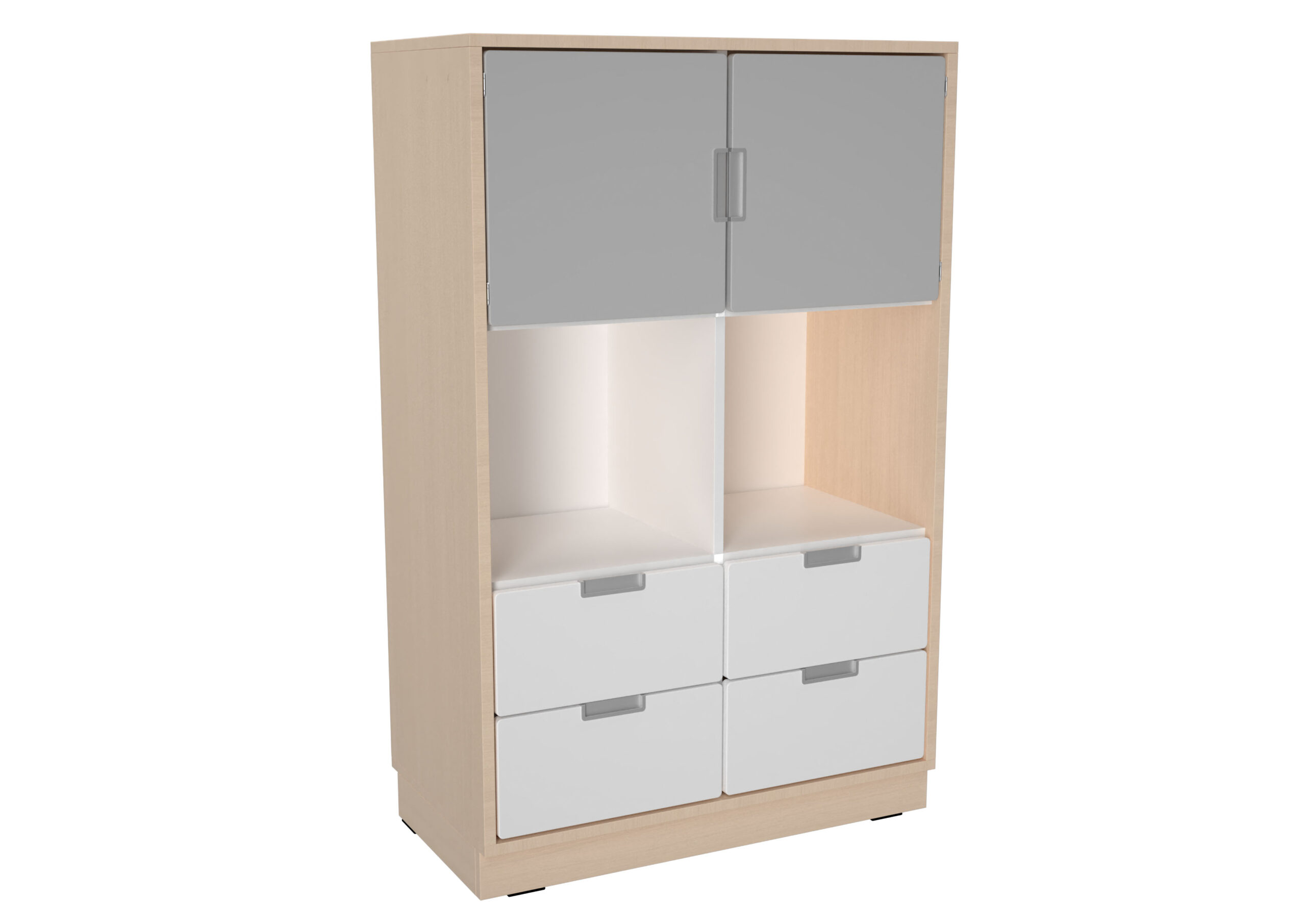 Baldai pagaminti iš 18 mm storio laminuotos klevo ir baltos spalvos plokštės, 18 mm storio frontai padengti patvaria termoplastine fanera.