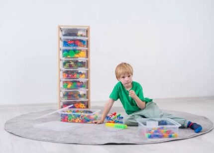Praktiškos ir garsą sugeriančios spintelės. Paviršius iš linoleumo – malonus liesti, patvarus ir lengvai valomas, tinka žaidimams.
