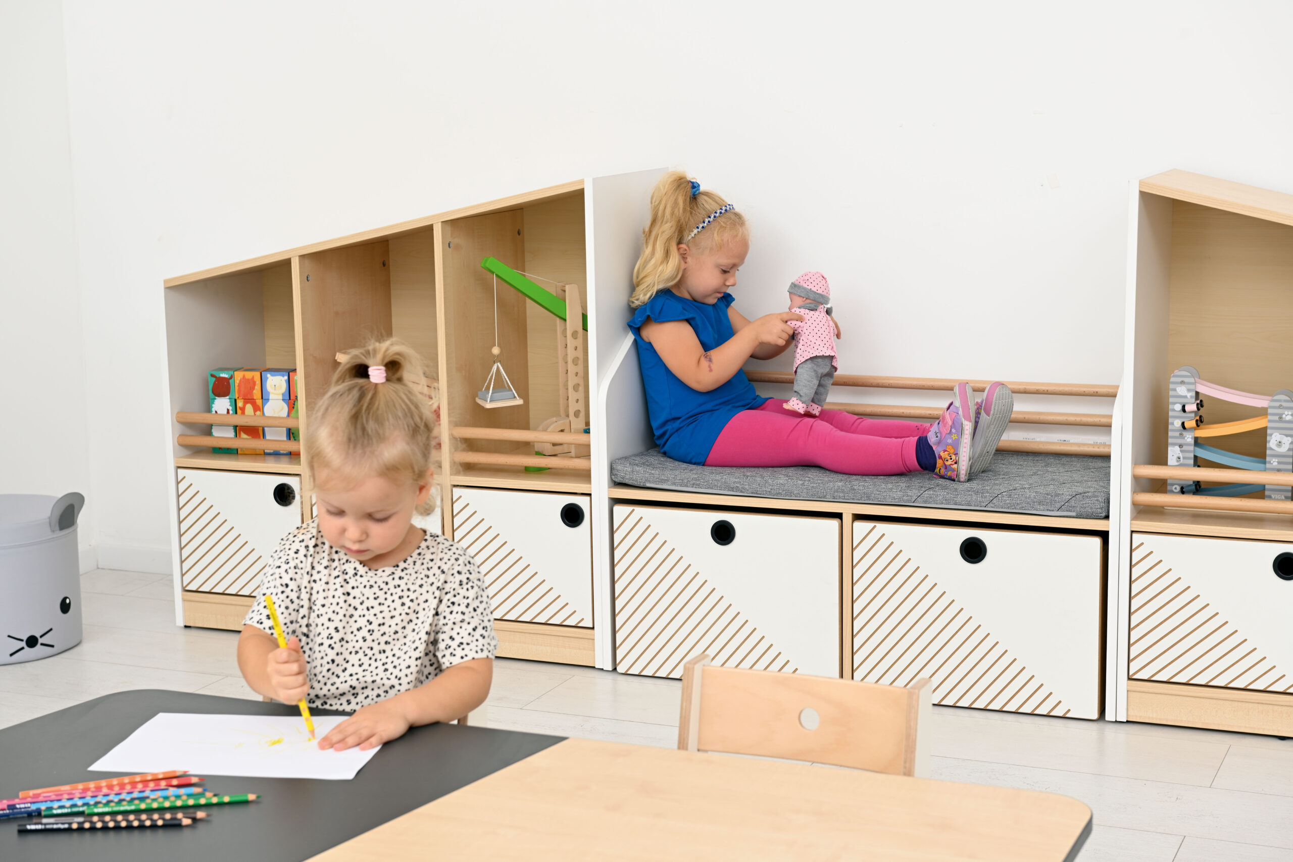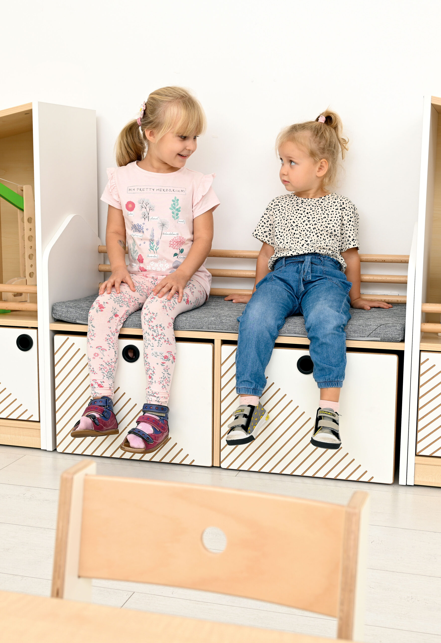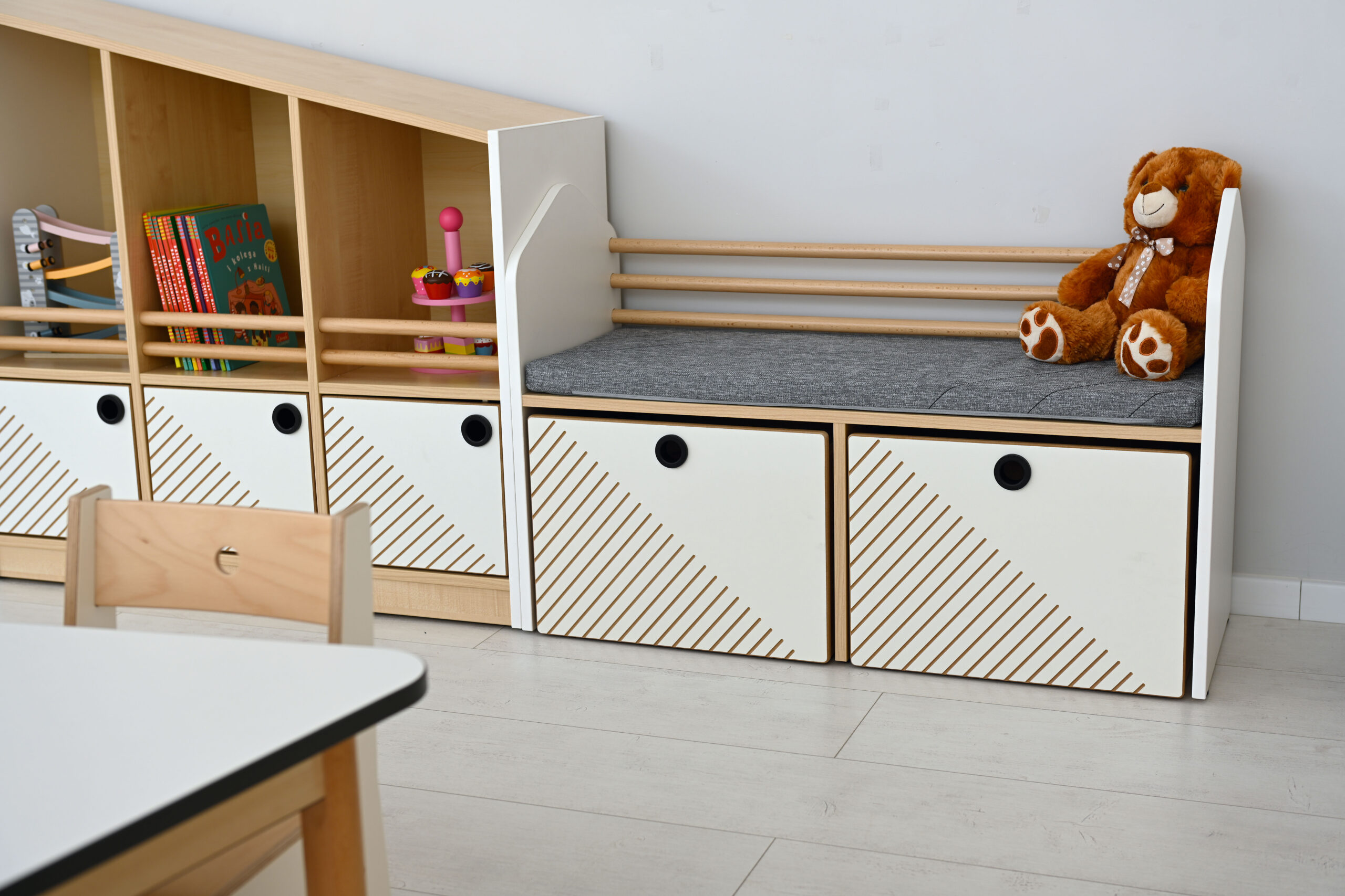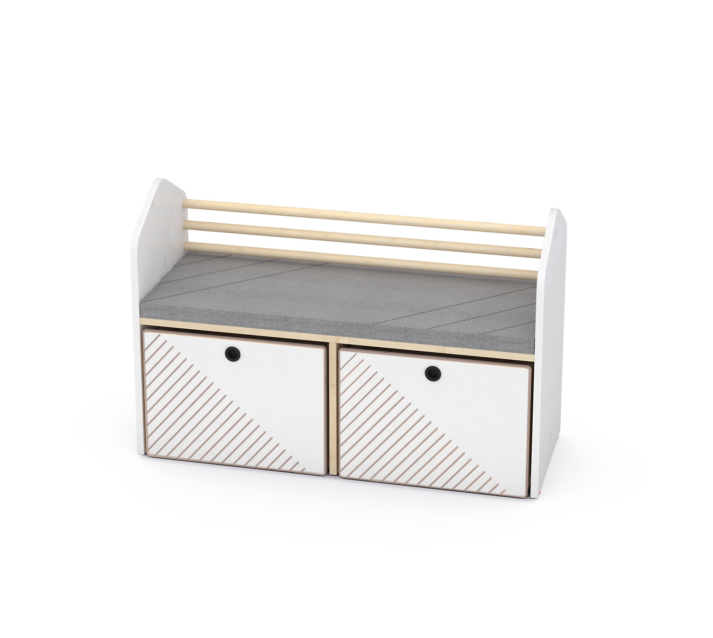 Spintelė su sėdyne ir talpiomis daiktadėžėmis ant ratukų. Spintelės korpusas pagamintas iš laminuotos medžio drožlių plokštės, o pjedestalų priekiai – iš abiejų pusių laminuotos MDF plokštės. Daiktadėžės turi praktiškus ratukus ir kolekcijai būdingą frezavimą bei minimalistines rankenėles lengvam ištraukimui. Viršuje yra patogus čiužinys, ant kurio galima atsisėsti, ir buko strypų formos atlošas.