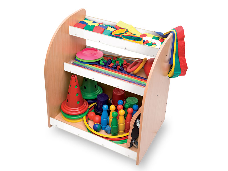 Sporto reikmenys: 1 regbio kamuolys, 3 putplasčio kamuoliai, 2 ringo kamuoliai, 16 žirnių maišelių, 16 diržų, 12 apyrankių, gimnastikos rinkinys, kėgliai, kubo kamuolys, 3 cirko lėkštės, 3 cirko kamuoliai, 3 poros mini kamuoliukų ir platforma ant ratukų.