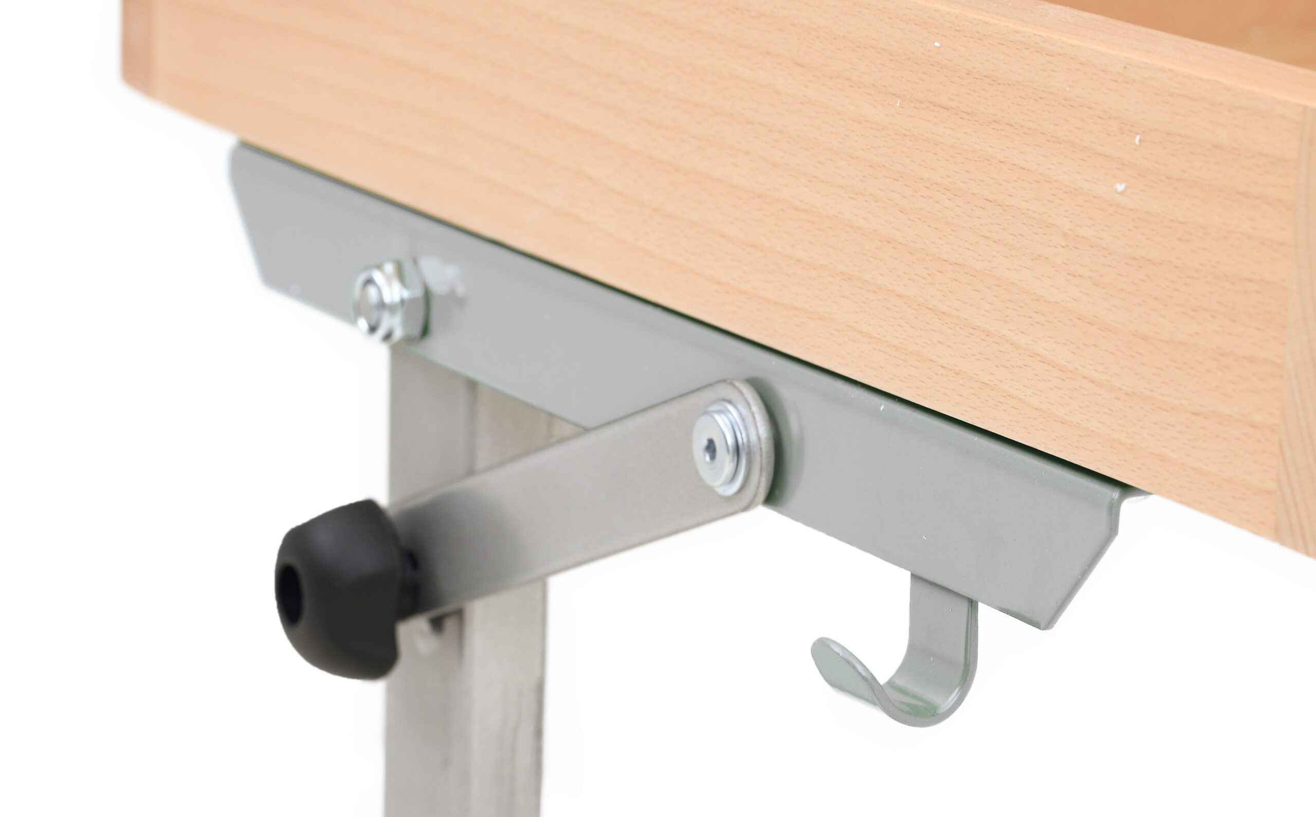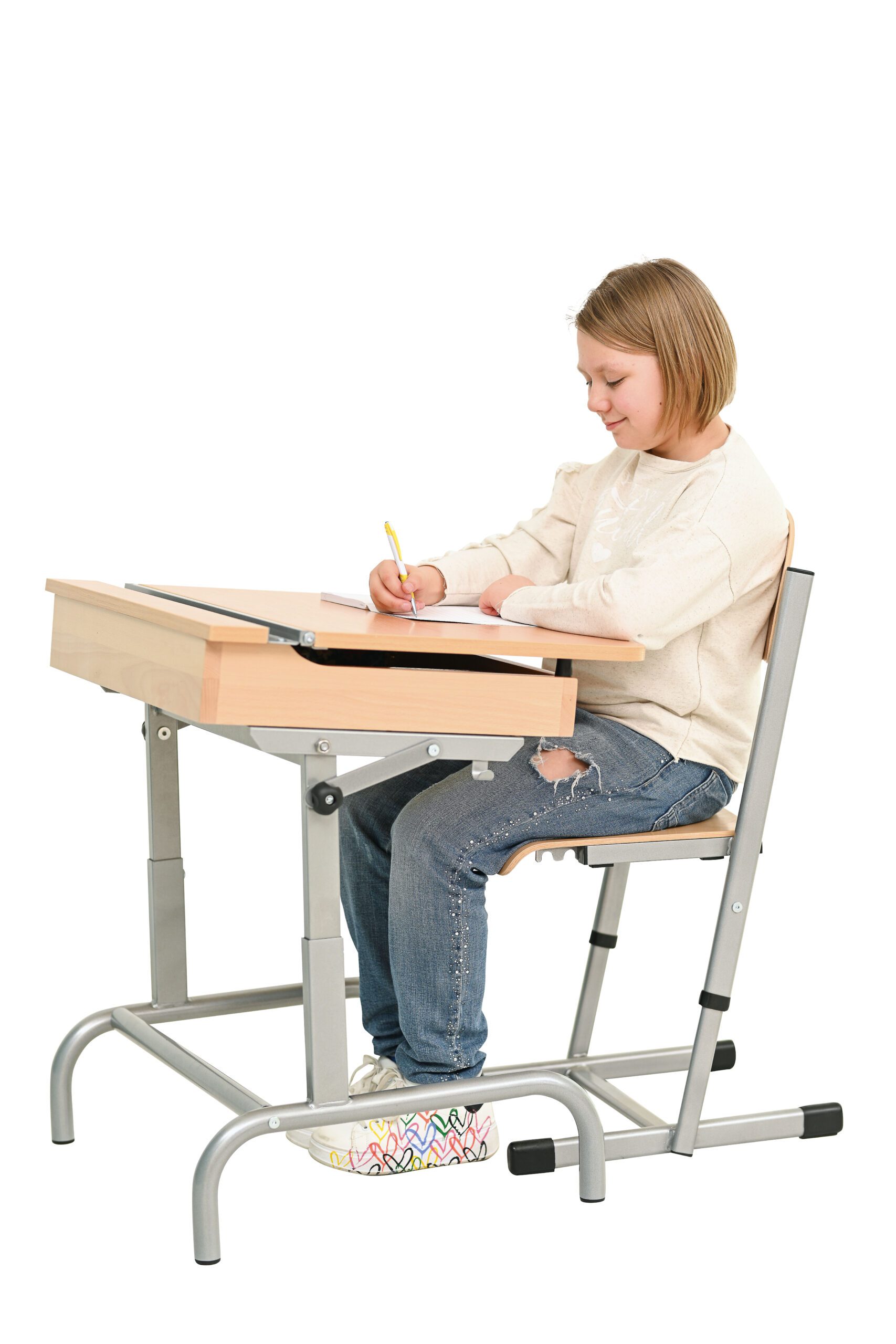 Reguliuojamo aukščio mokyklinis stalas su natūralaus medžio atidaroma pasuole knygoms ar nešiojamam kompiuteriui. Tvirtas metalinis rėmas, reguliuojamas pasvirimo kampas, užapvalinti kampai, atrama kojoms, dėklas rašikliams ir apsaugos nuo grindų subraižymo. Tinka 3–5 klasių mokiniams. Atitinka PN EN 1729-1:2016-02 ir PN EN 1729-2:2023-10 standartus.