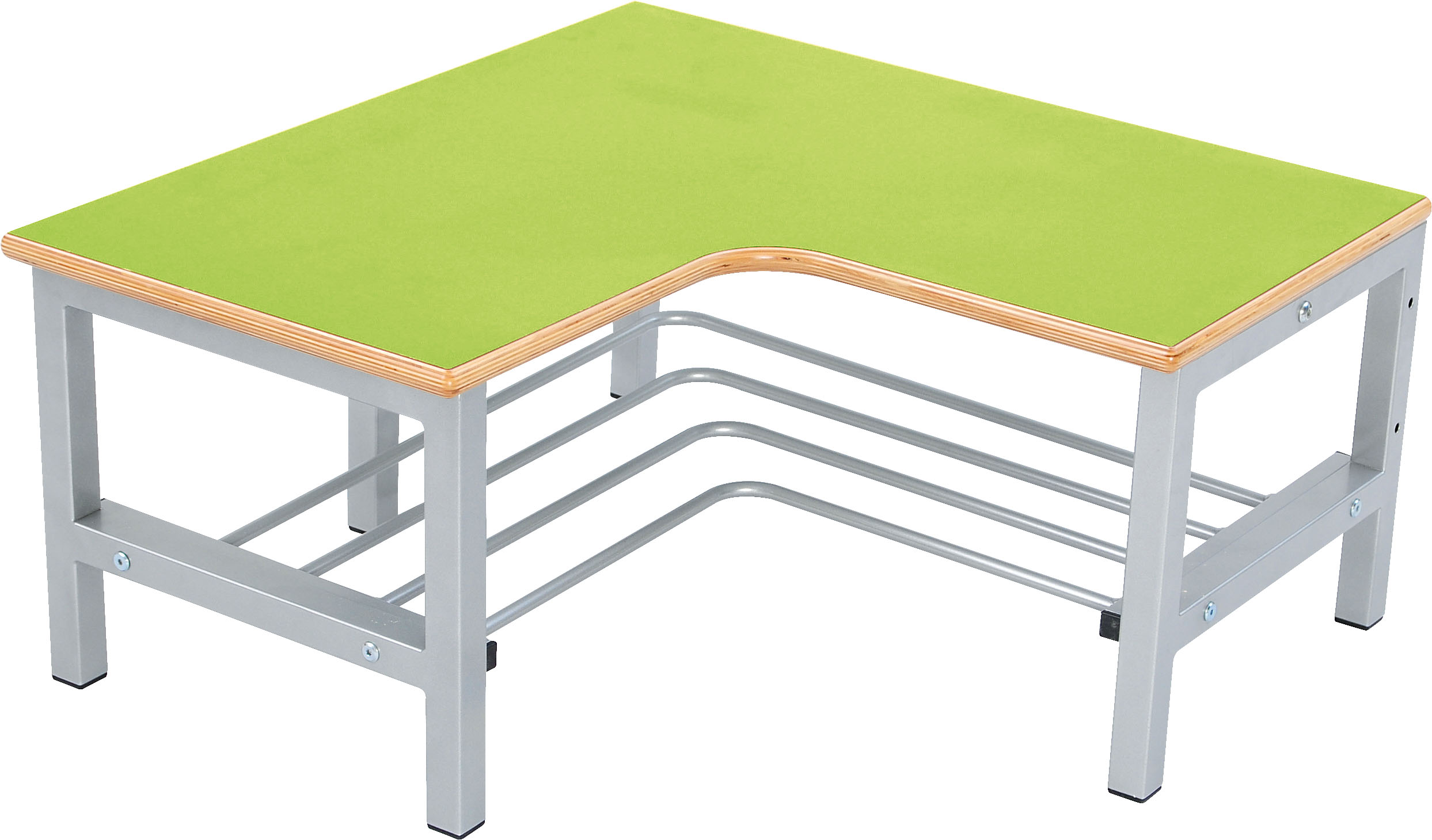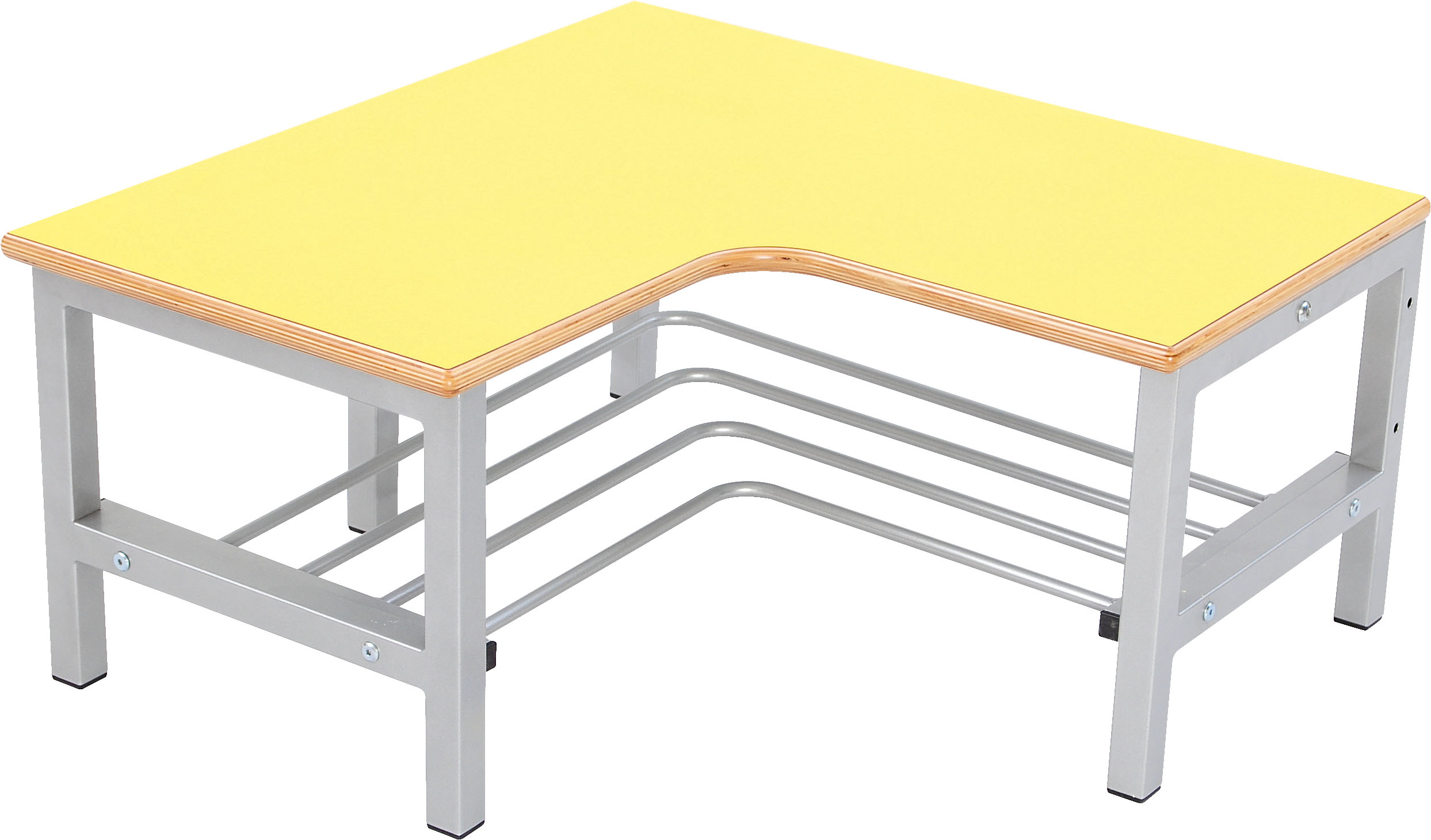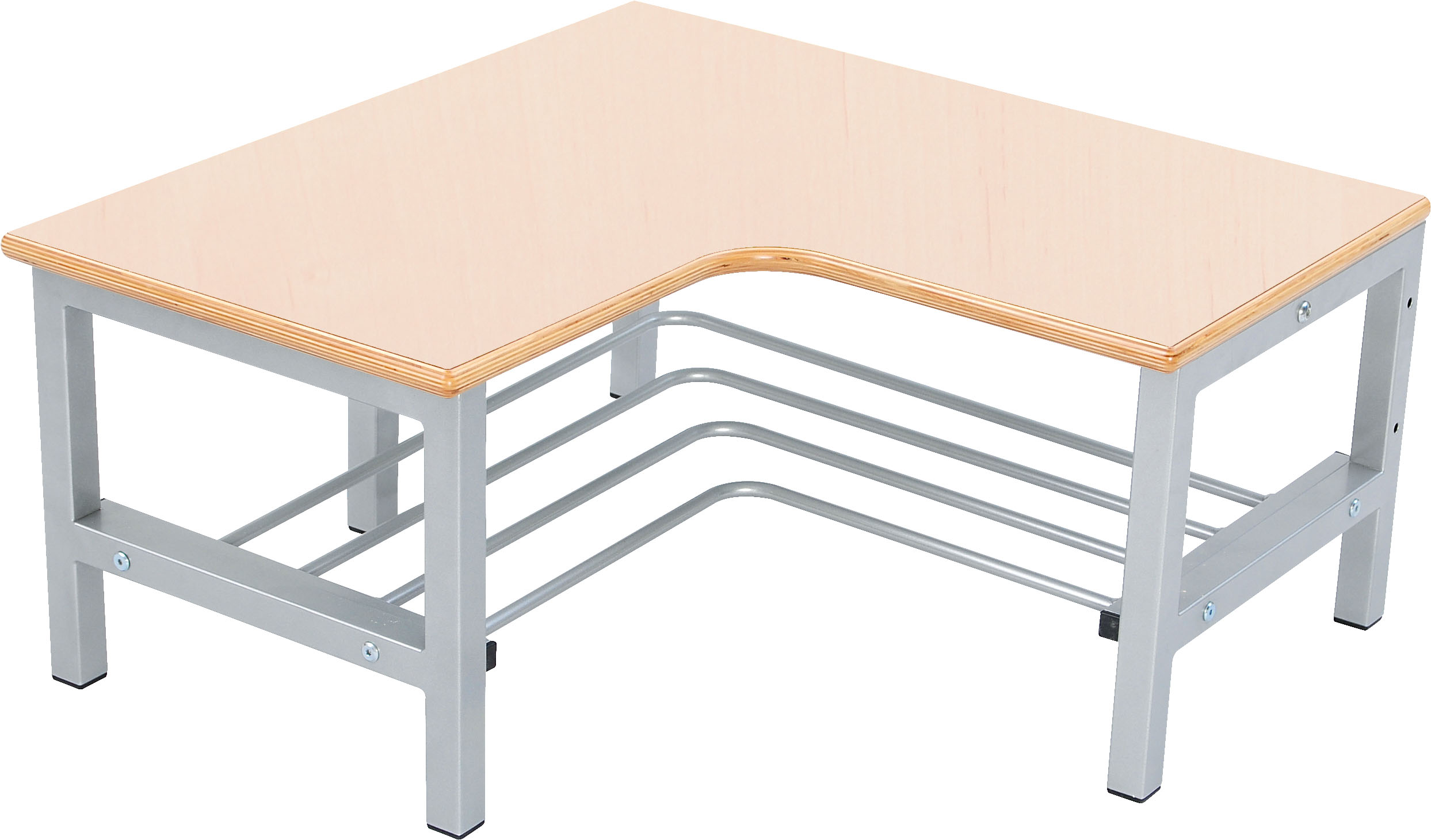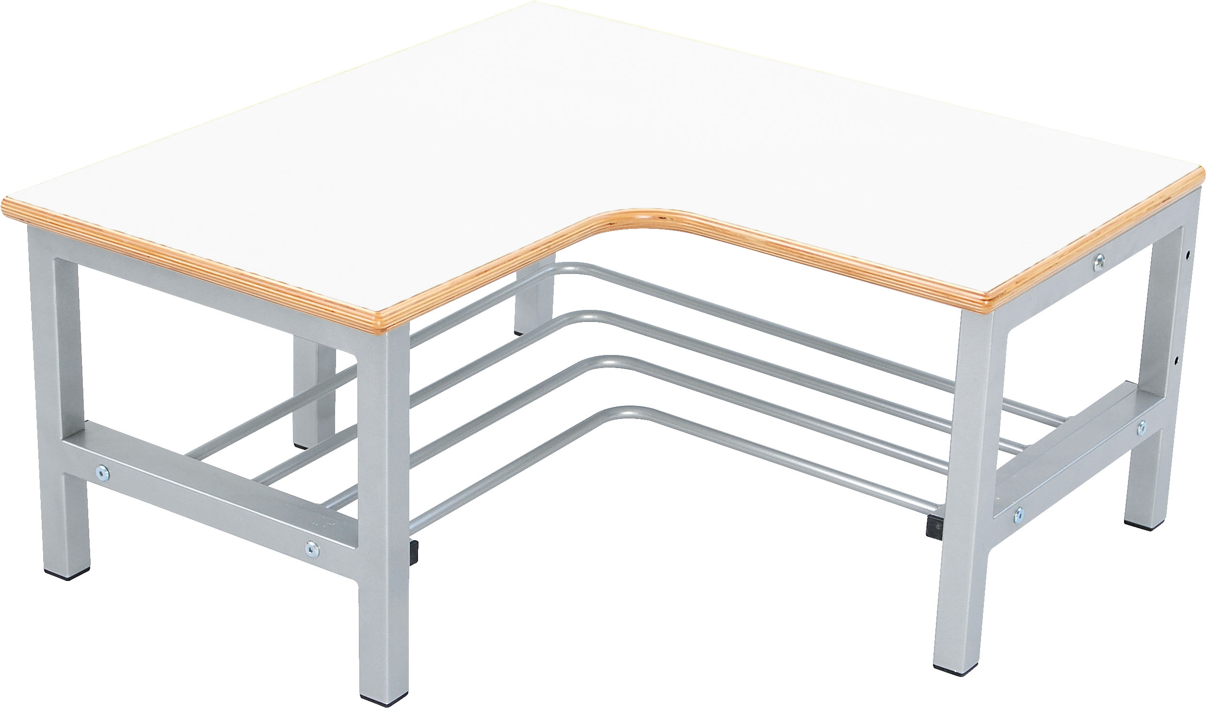 Kampinis suolas ant stabilaus metalinio rėmo, su lentynėle batams. Sėdynė pagaminta iš 19 mm storio faneros su spalvotu HPL laminatu.