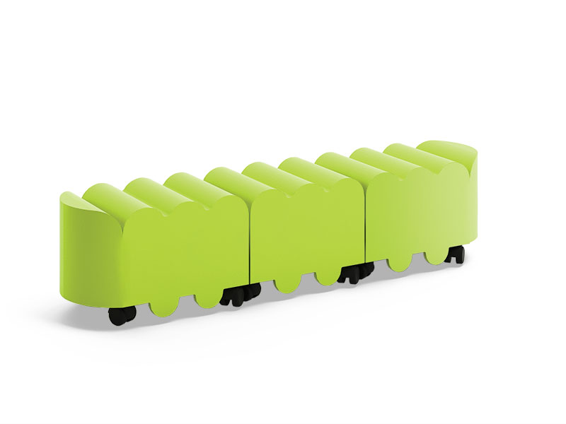 Baldų rinkinys ant ratukų 3 vnt., kurių dydis 36 x 30 x 30 cm, pagaminti iš medžio drožlių plokštės / MDF. Paviršius: lygus. Šviesiai žalios spalvos priekis. Minkšta sėdimoji dalis iš PVC.