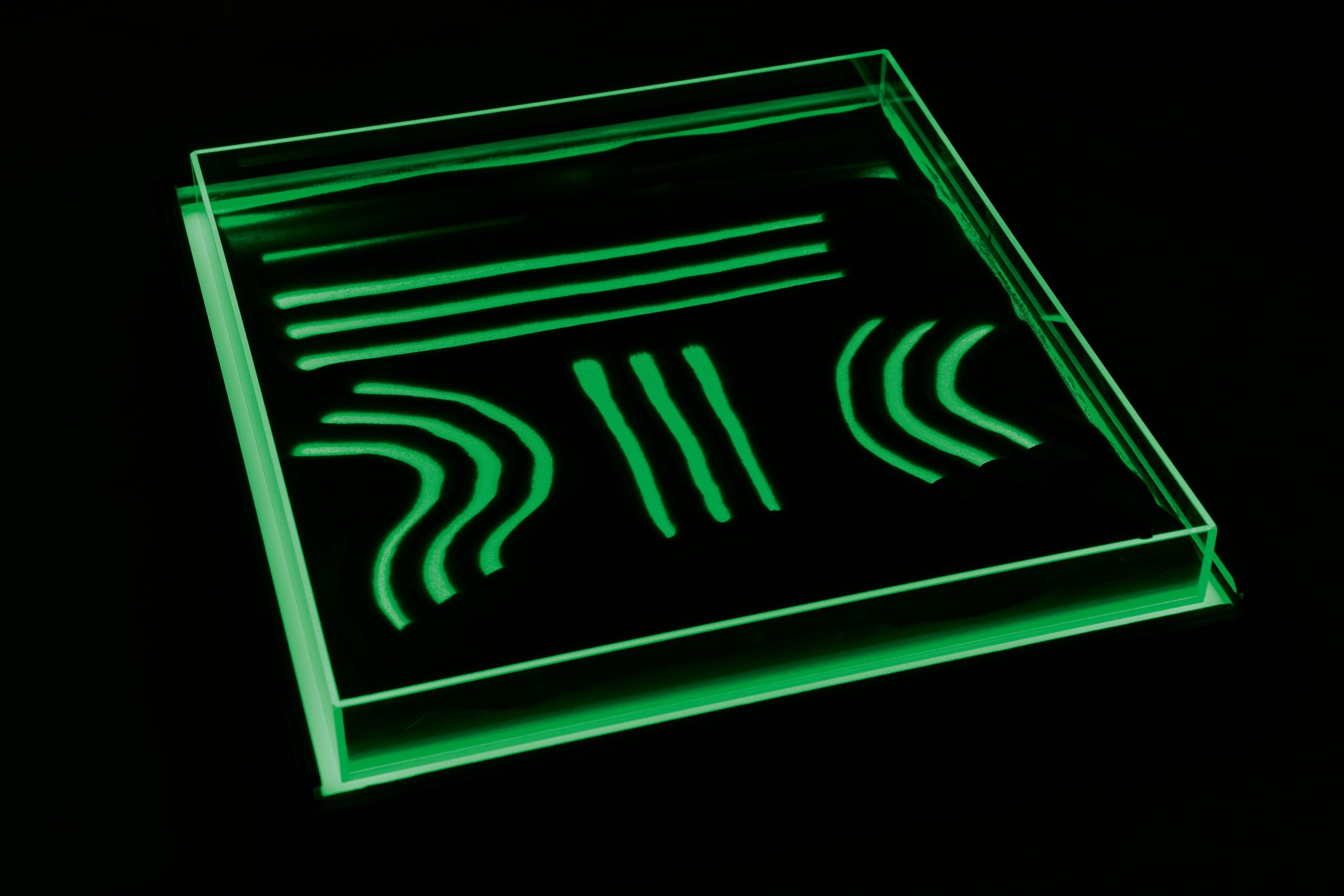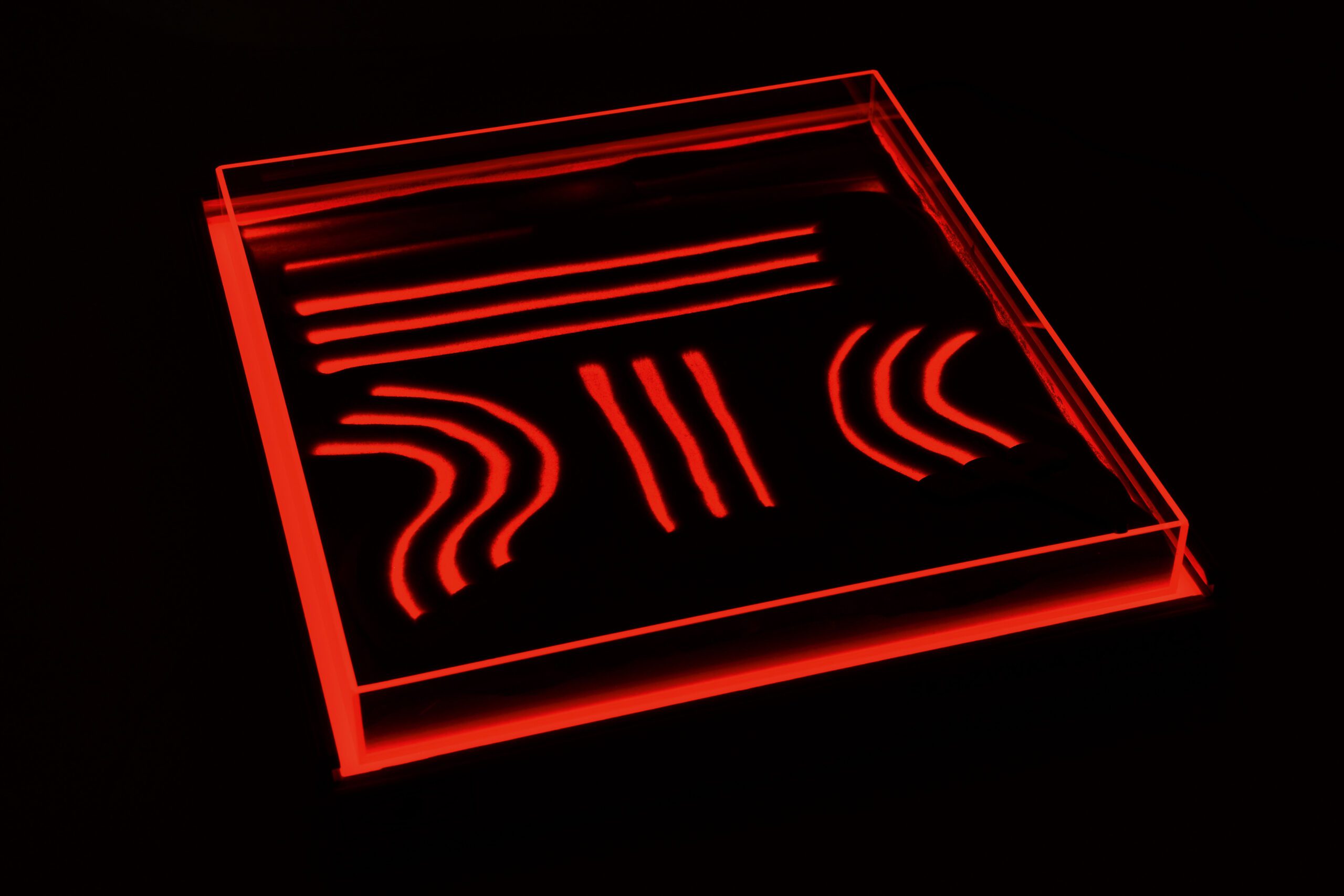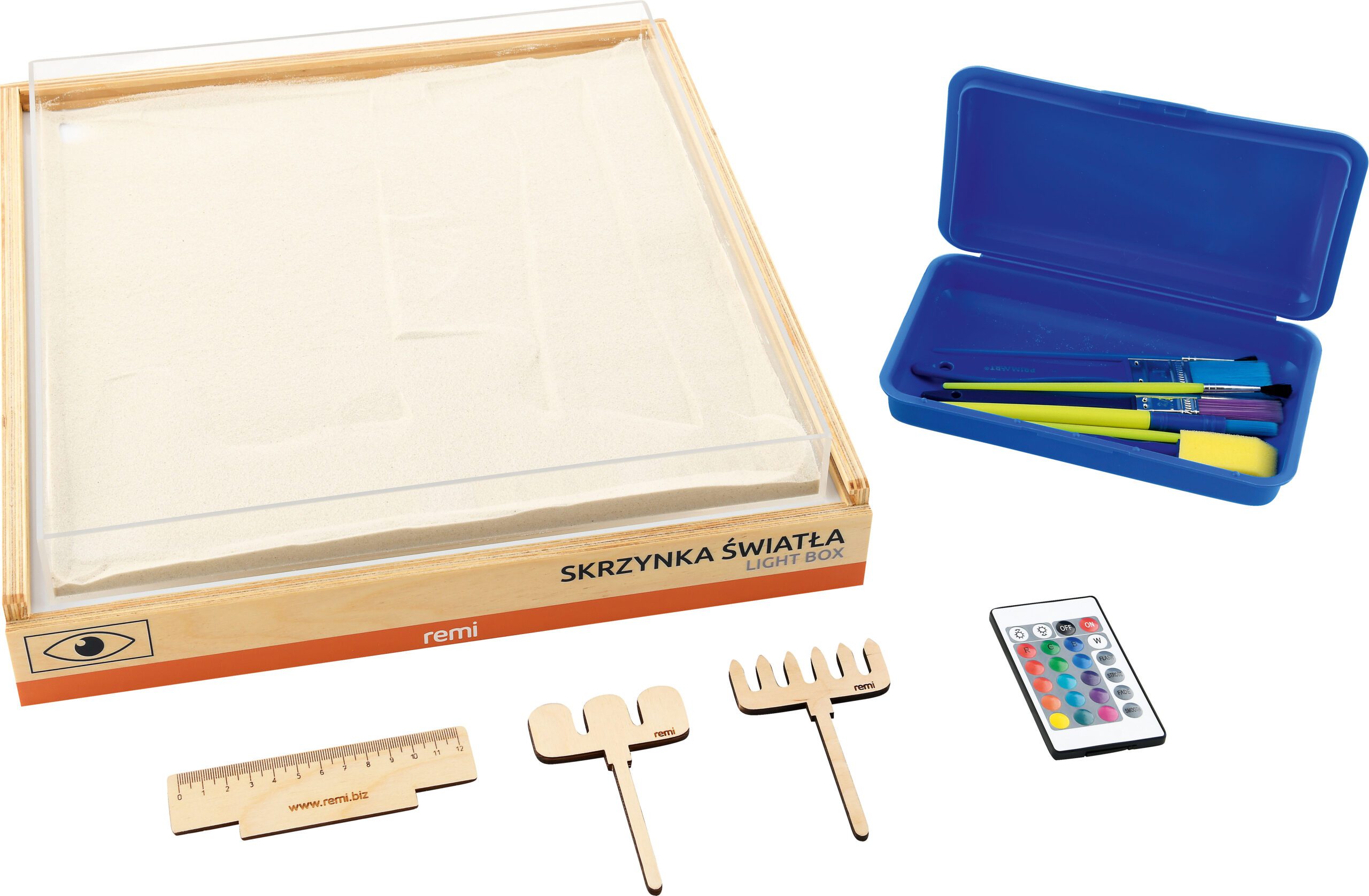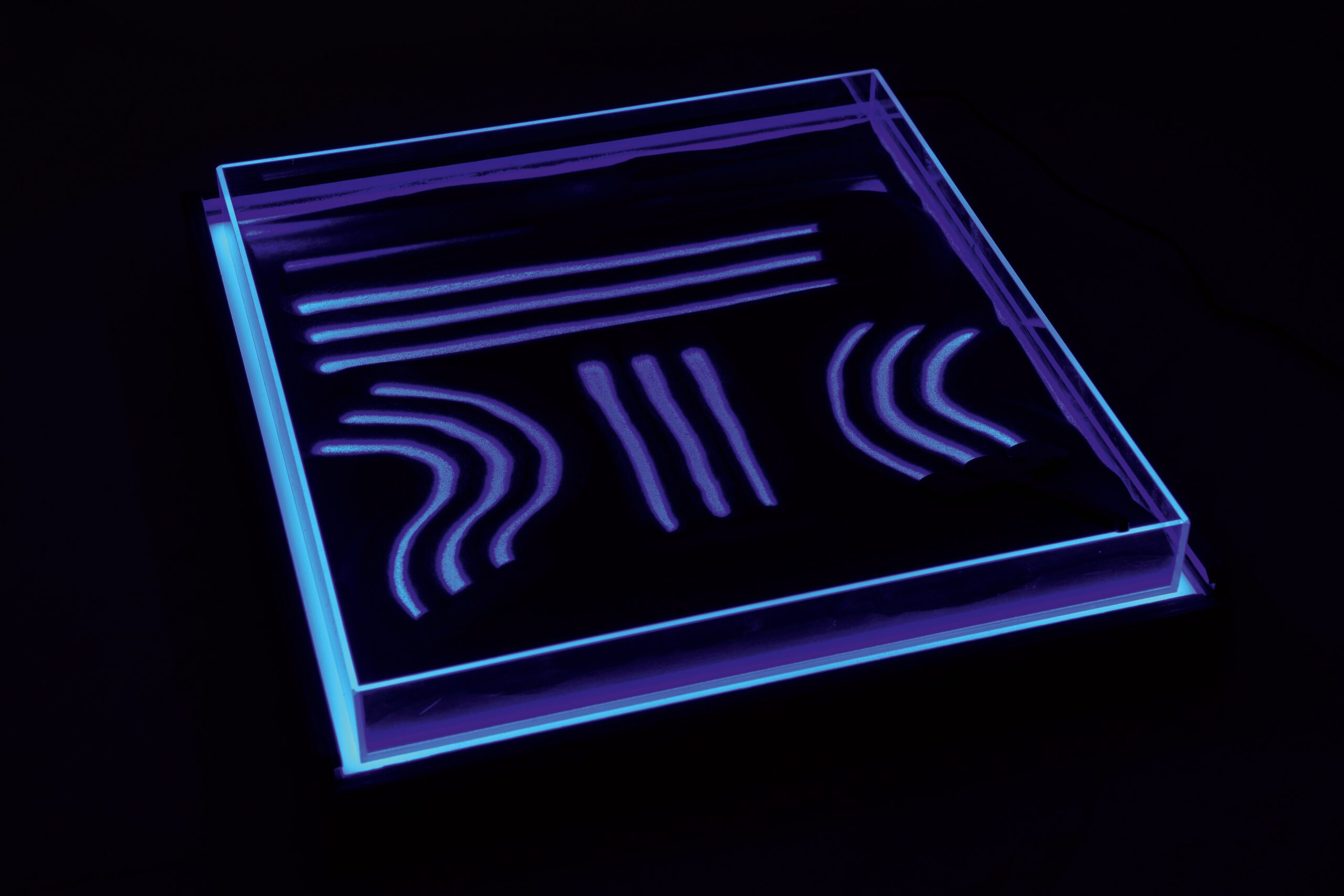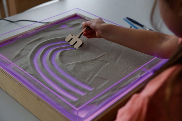 Jutimų integracijos rinkinys – padeda tinkamai vystytis regėjimui ir lytėjimui. Padėkite padėklą ant šviesos dėžės ir užpildykite jį smėliu ar kitomis žaidimo medžiagomis, pvz., kruopomis ar makaronais. Vaiko užduotis – piešti ar rašyti smėlyje, naudodamas įvairių storio ir formos priedus. Piešimo metu paviršius apšviečiamas. Spalvas ir šviesos intensyvumą galima keisti nuotolinio valdymo pultu.