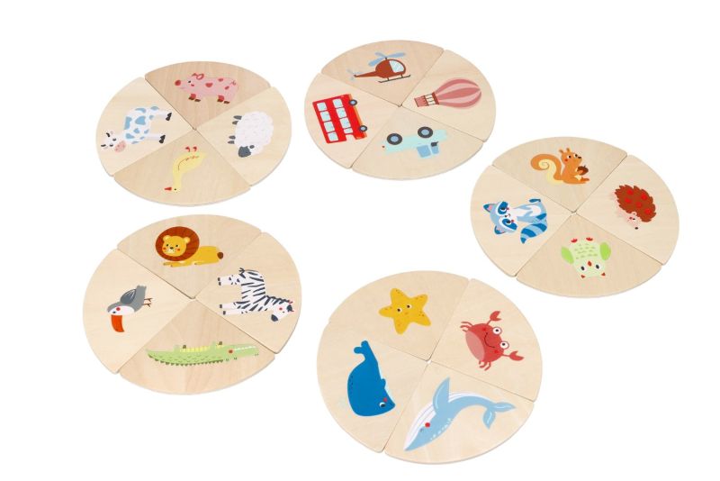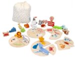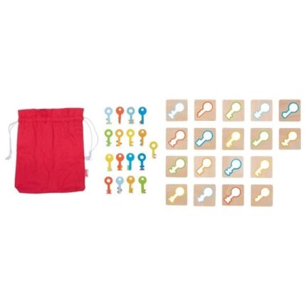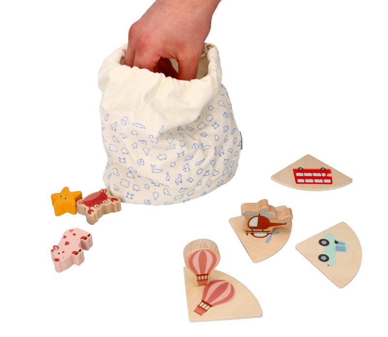 Šį medinį „Touch and Match“ žaidimo rinkinį sudaro 20 medinių dėlionių, 20 skirtingų kaladėlių ir medvilninis maišelis. Pasirinkite paveikslėlį iš dėlionių ir įkiškite ranką į medvilninį maišelį, kad palietę atpažintumėte atitinkančią detalę. Padeda lavinti vaikų pojūčius, lytėjimo ir smulkiąją motoriką.
