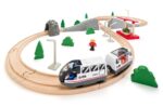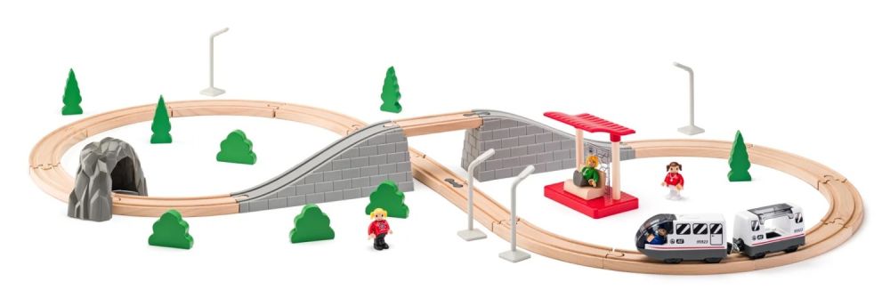 Traukinių rinkinys su aštuonios formos bėgiais yra pagrindinis mūsų traukinių rinkinių asortimento produktas. Jį sudaro bėgiai, tiltas, plastikinis tunelis, traukinių stotelė, elektrinis traukinys su keleivių salonu, 4 lempos, 4 figūrėlės su judamais galūnais, medžiai ir krūmai. Šį pagrindinį rinkinį galima papildyti daugybe priedų, kuriuos rasite mūsų pasiūlymuose.