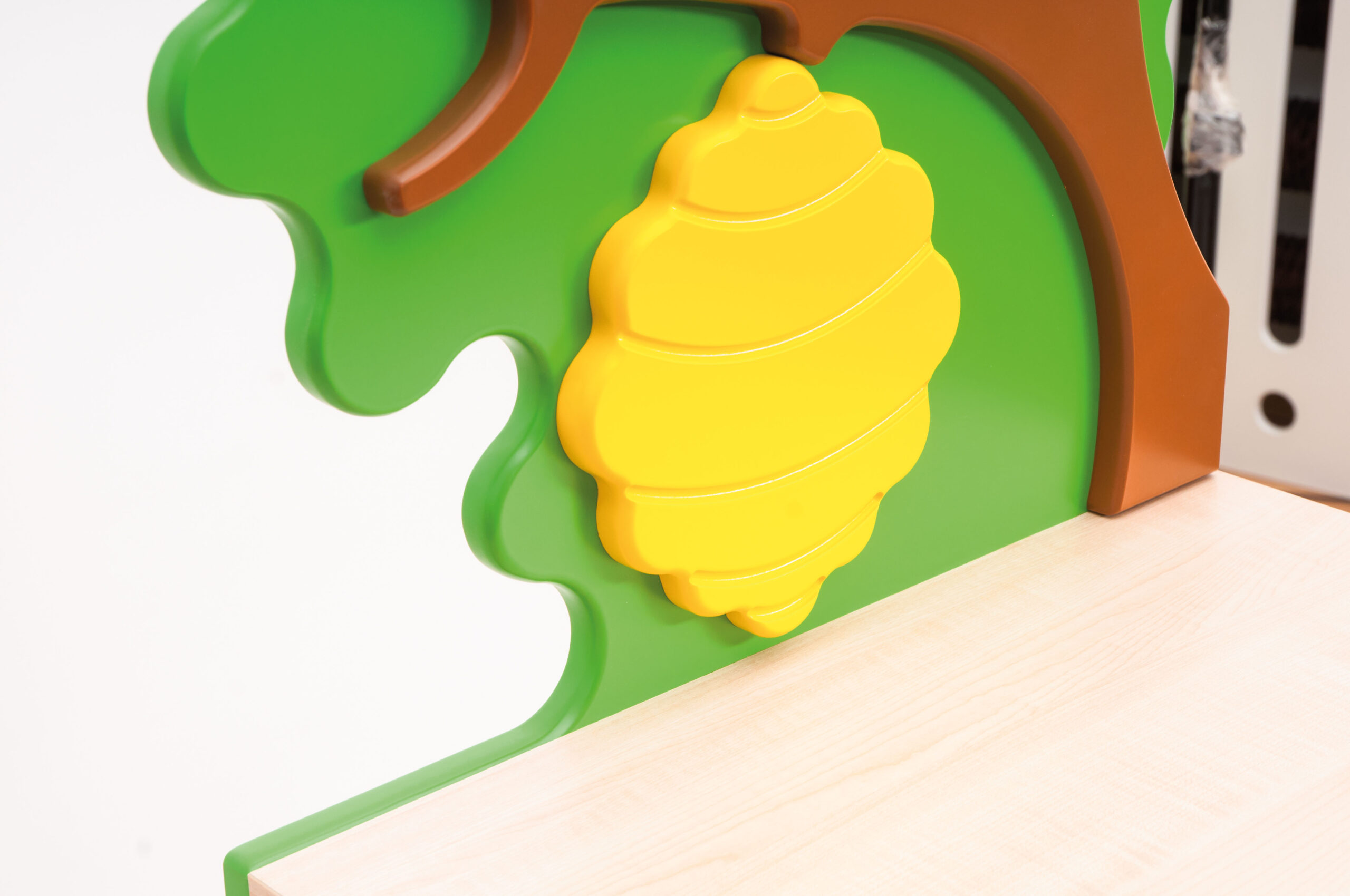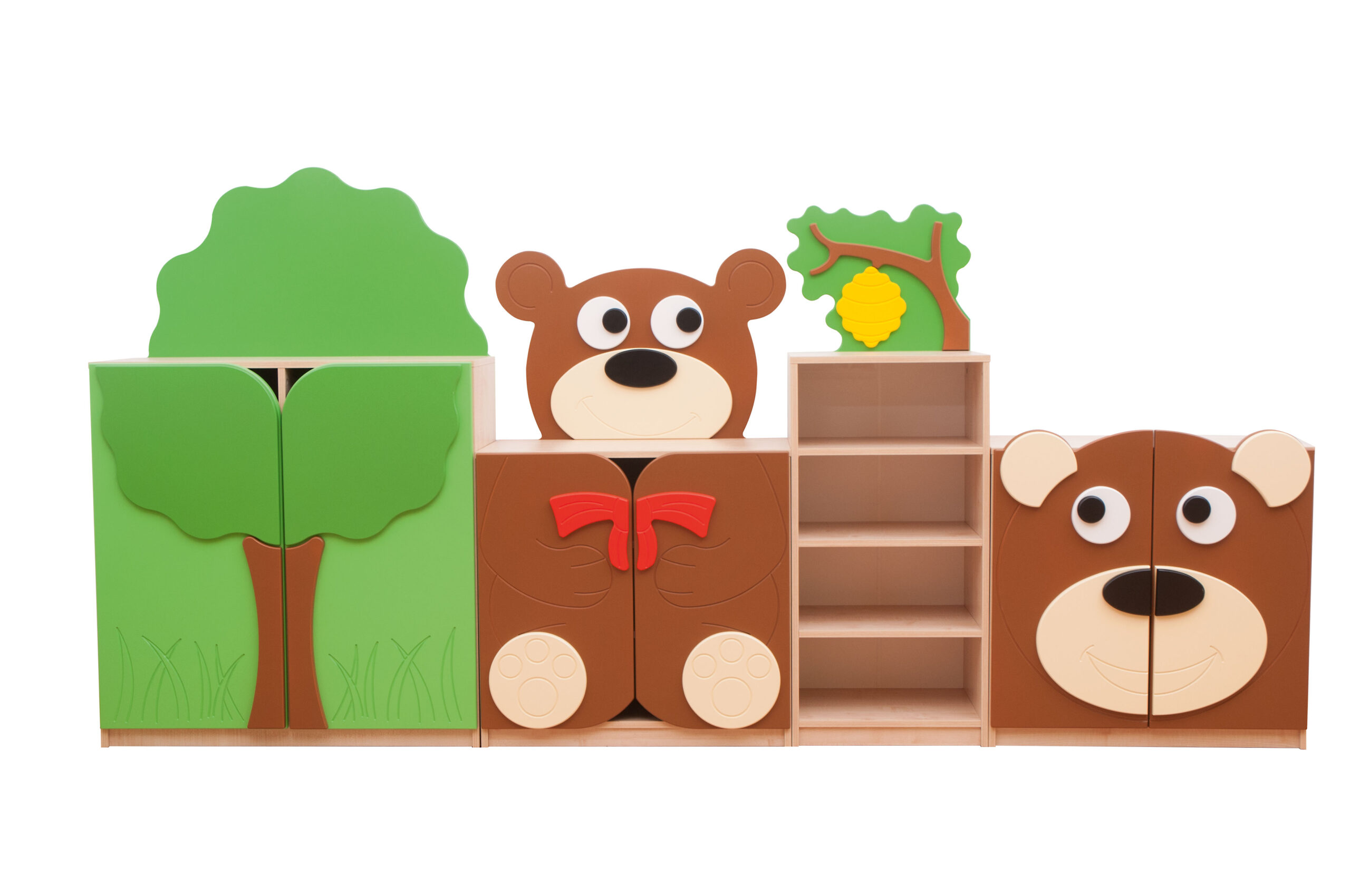 Keturių baldų rinkinys, kuriame vaizduojamas miško vaizdas su bičių aviliu, vaizdingas medis, besišypsanti meškutė, atidžiai stebinti mažą meškiuką… arba bet kokia kita kartu su vaikais sugalvota istorija apie vaikų pamėgtus draugiškus gyvūnus. Maloni žalia priekinių dalių spalva, prislopinti rudos spalvos meškiukų personažų atspalviai, aptakios pasakų aplikacijų formos suteikia neįprastą, šiltą charakterį bet kuriam kambariui. Jos suteikia žavesio, neblaškydamos vaikų dėmesio ryškiomis spalvomis ar raštais. Trimatės aplikacijos pagamintos iš lakuotos MDF plokštės. Korpusas pagamintas iš klevo medienos drožlių plokštės.