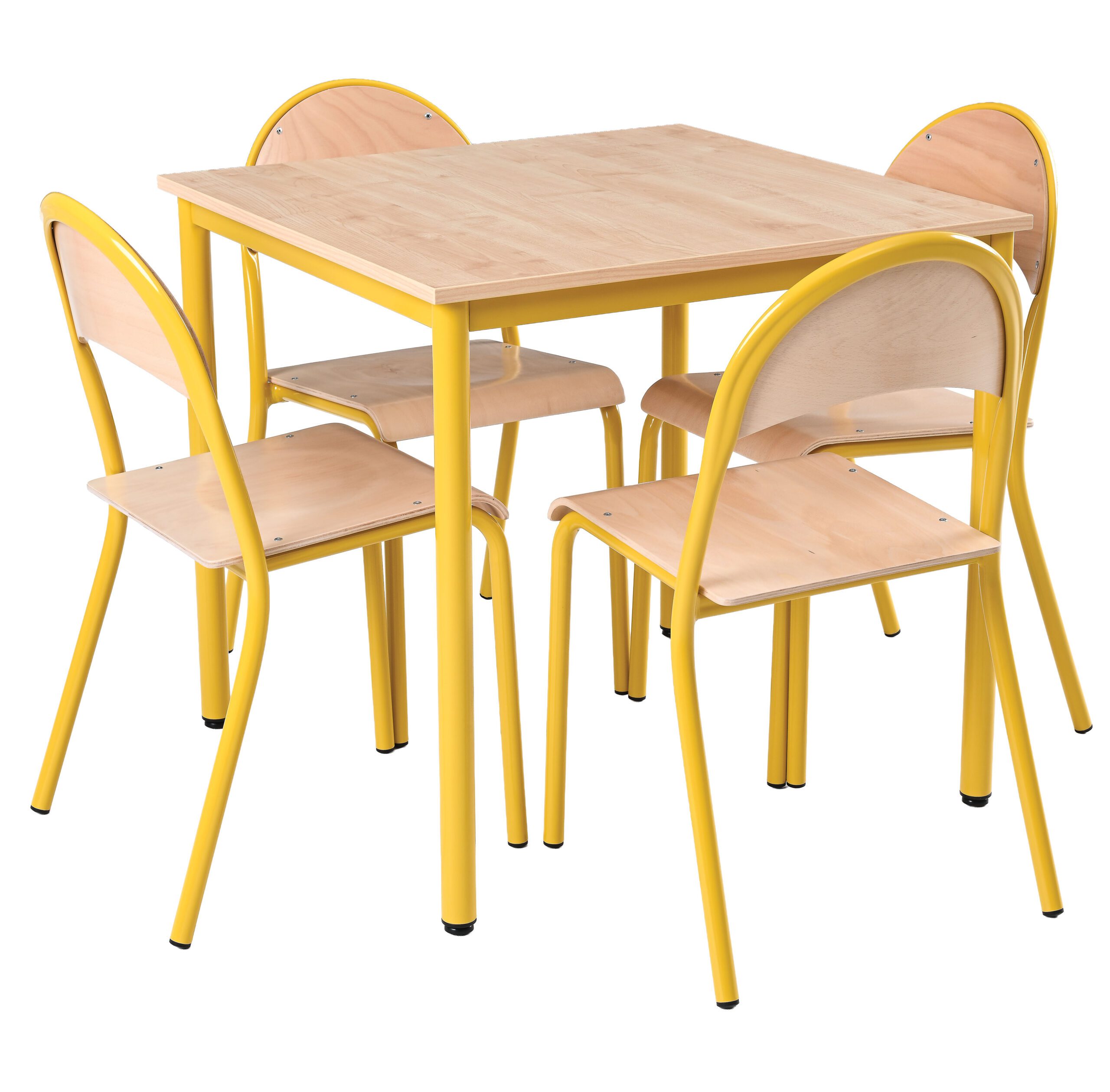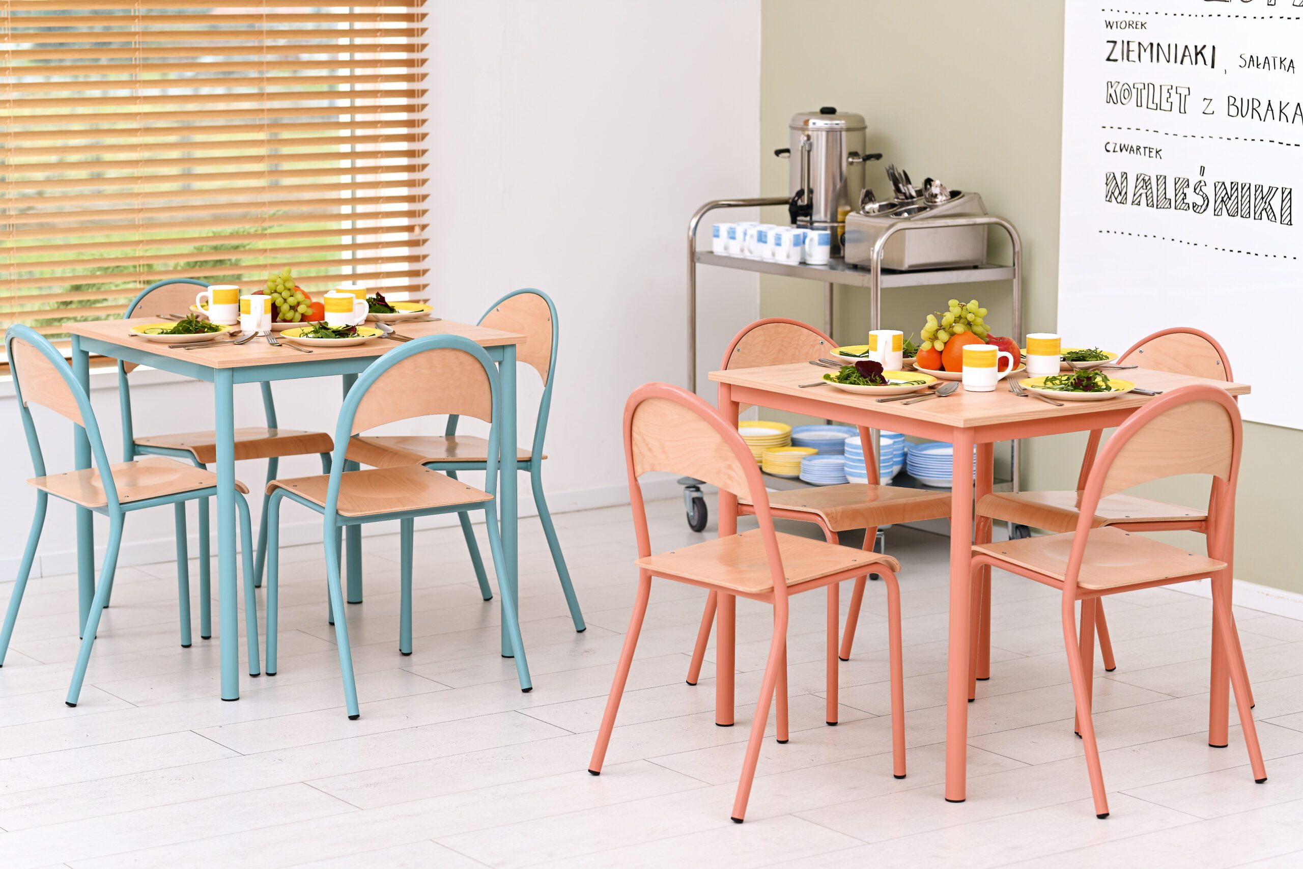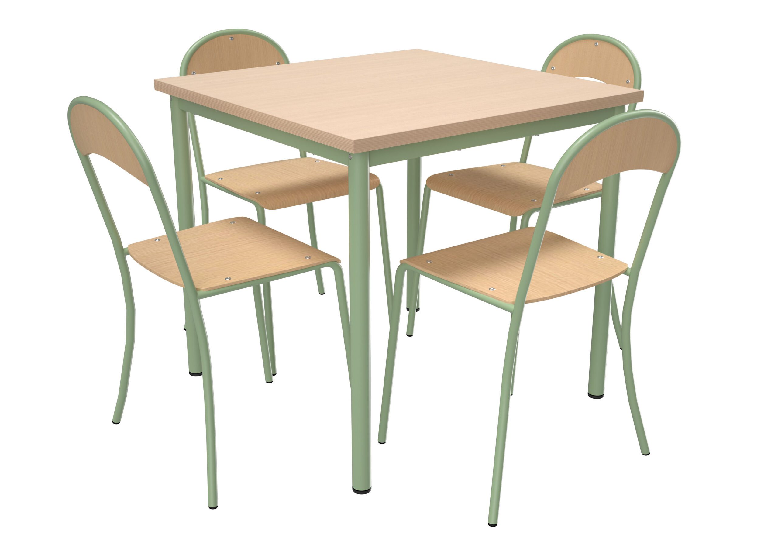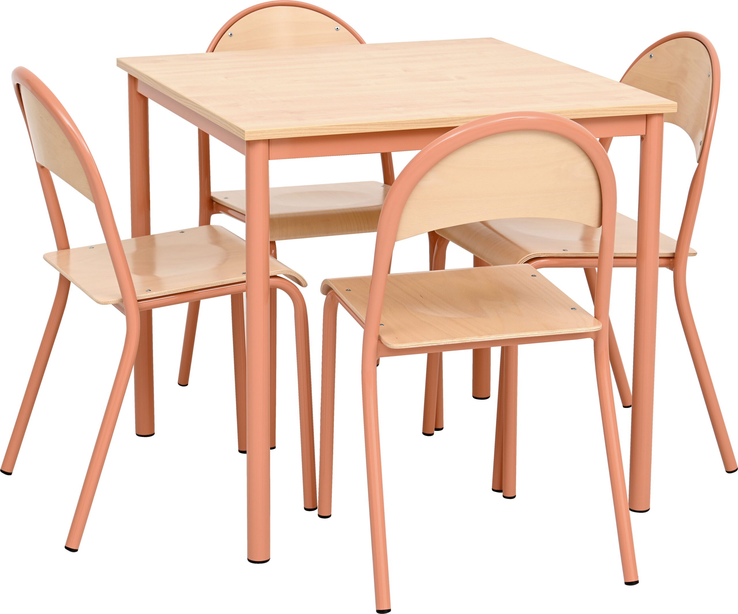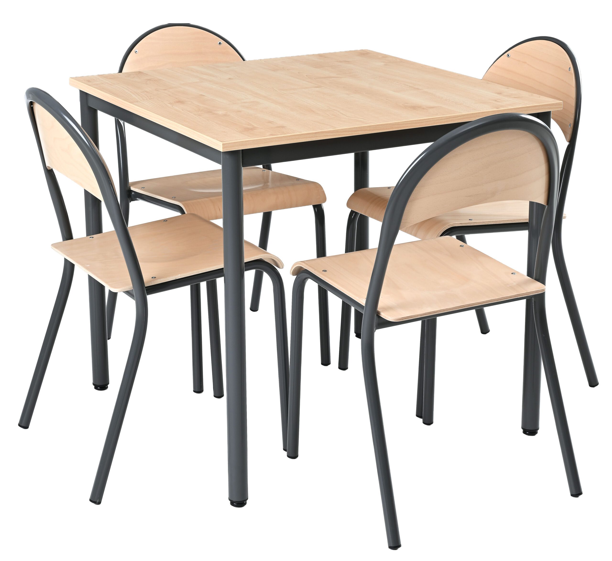 Stilingas ir funkcionalus stalų bei kėdžių komplektas „Mila“, skirtas 4 asmenims. Puikiai tinka mokyklų valgykloms, poilsio zonoms ar bendroms erdvėms.