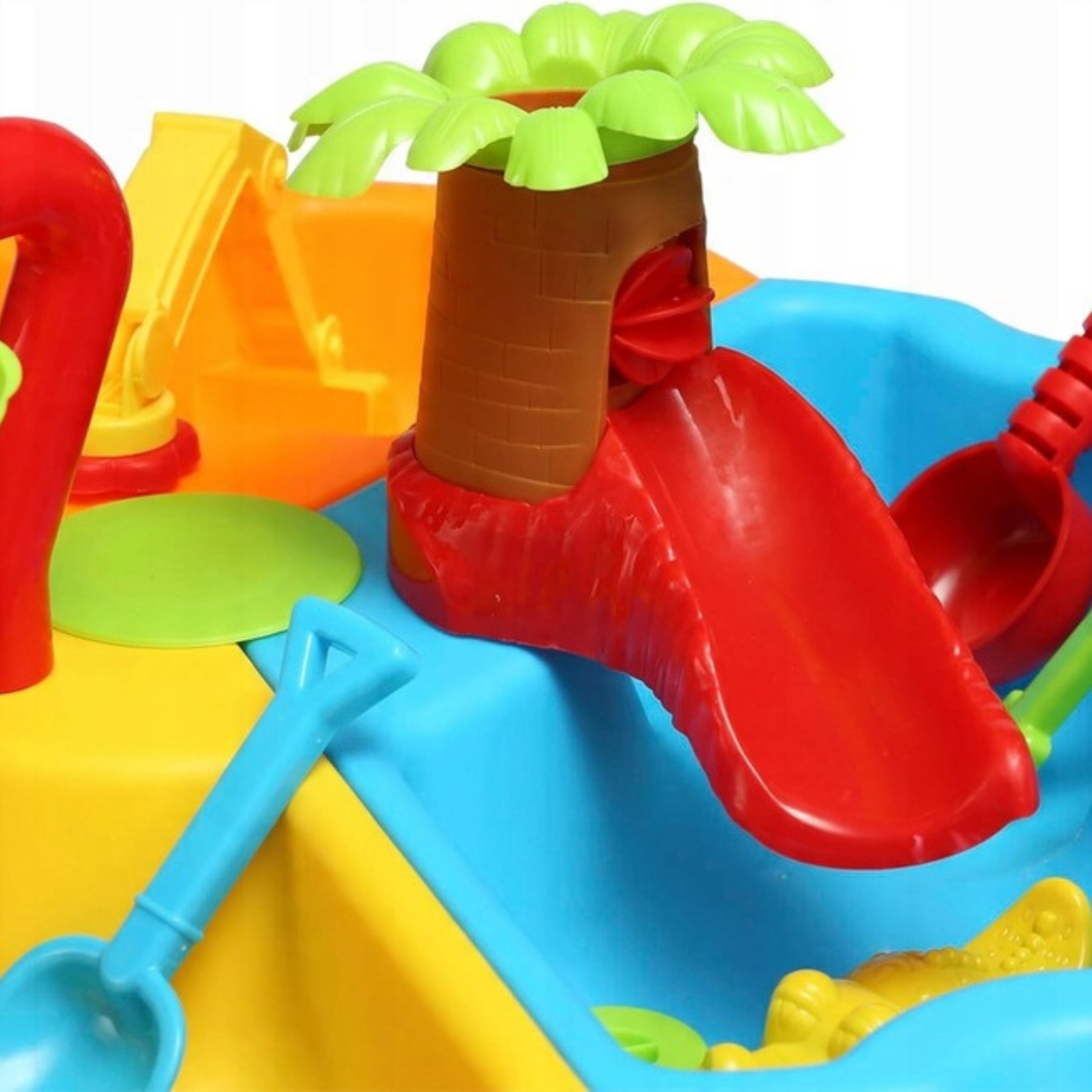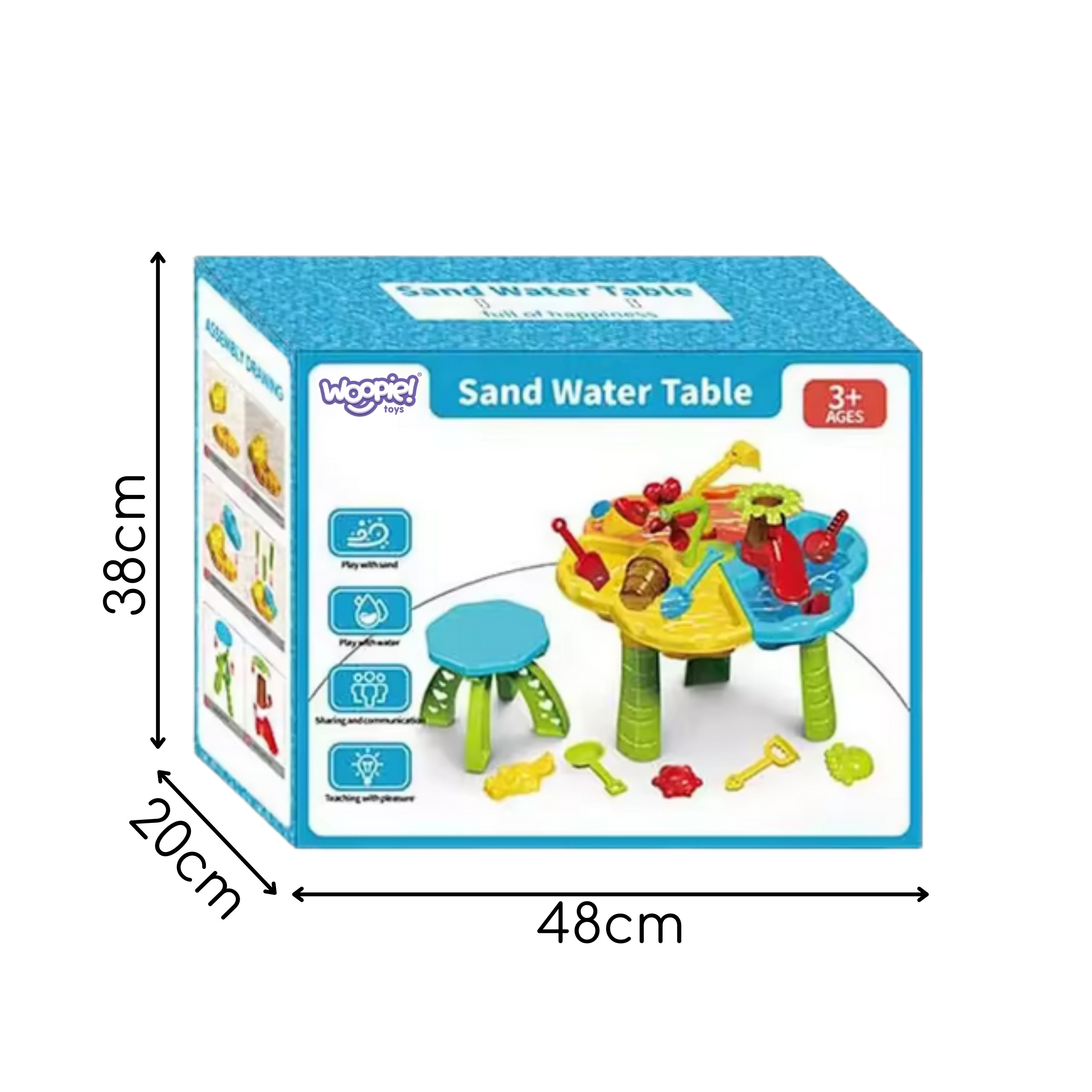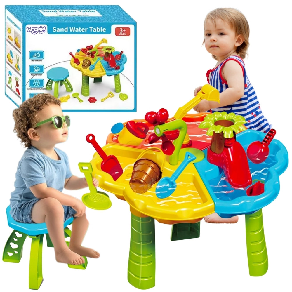 Vandens ir smėlio stalas su kėde – žaidimų rinkinys vaikams nuo 3 metų, tinkamas naudoti namuose ir lauke. Trijų skyrių stalas leidžia vienu metu žaisti su vandeniu ir smėliu, skatina kūrybiškumą, vaizduotę ir smulkiąją motoriką.