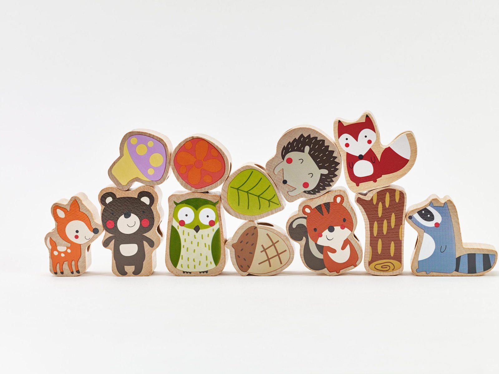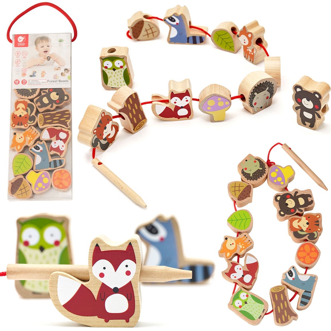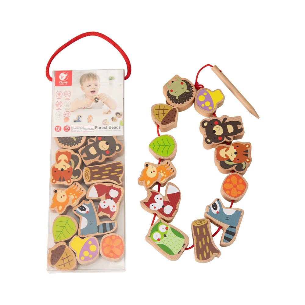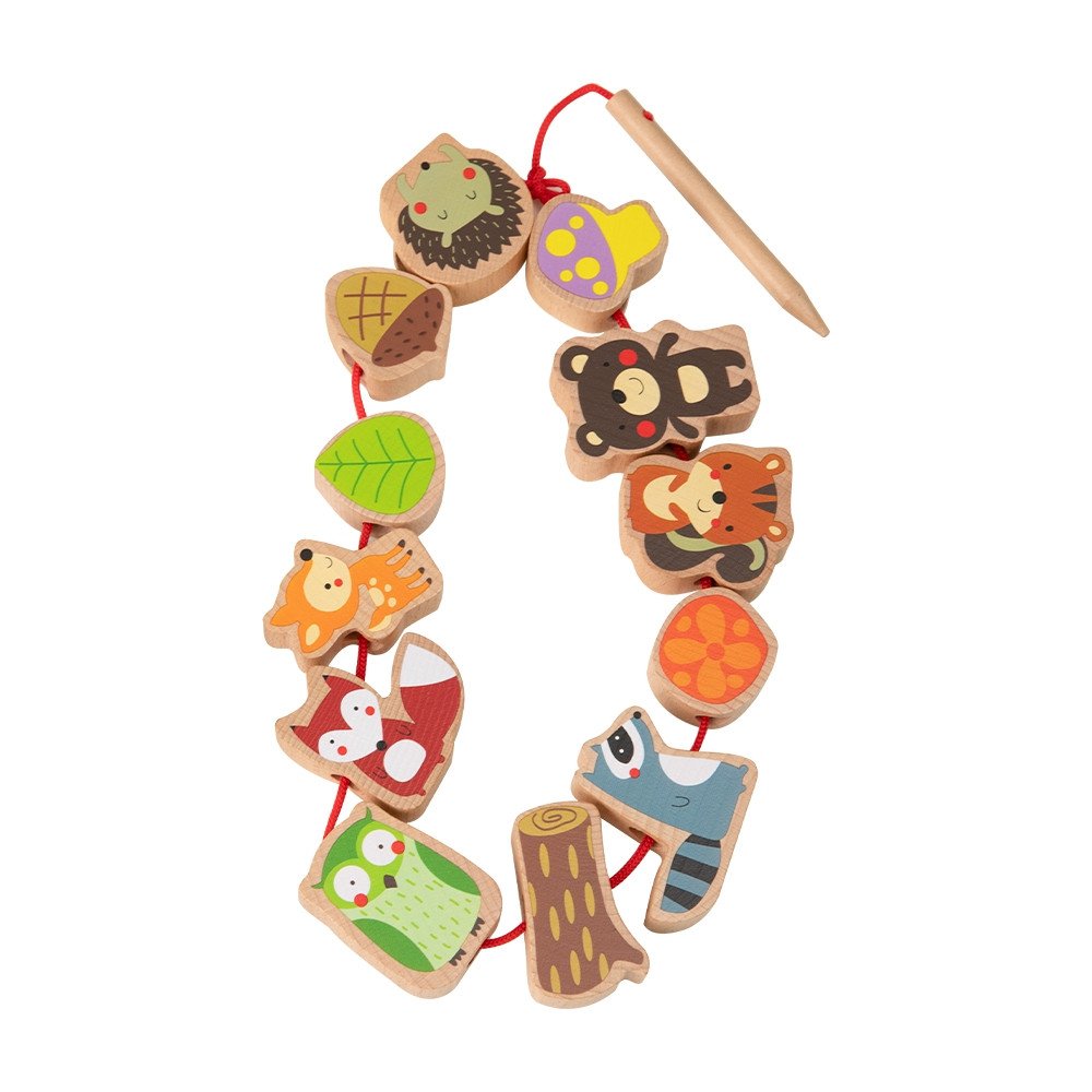 - – Rinkinį sudaro siūlas ir 12 karoliukų, vaizduojančių įvairius miško gyvūnus ir augalus, įskaitant: ežiuką, pelėdą, pušies kankorėžį, lapą ir grybą.