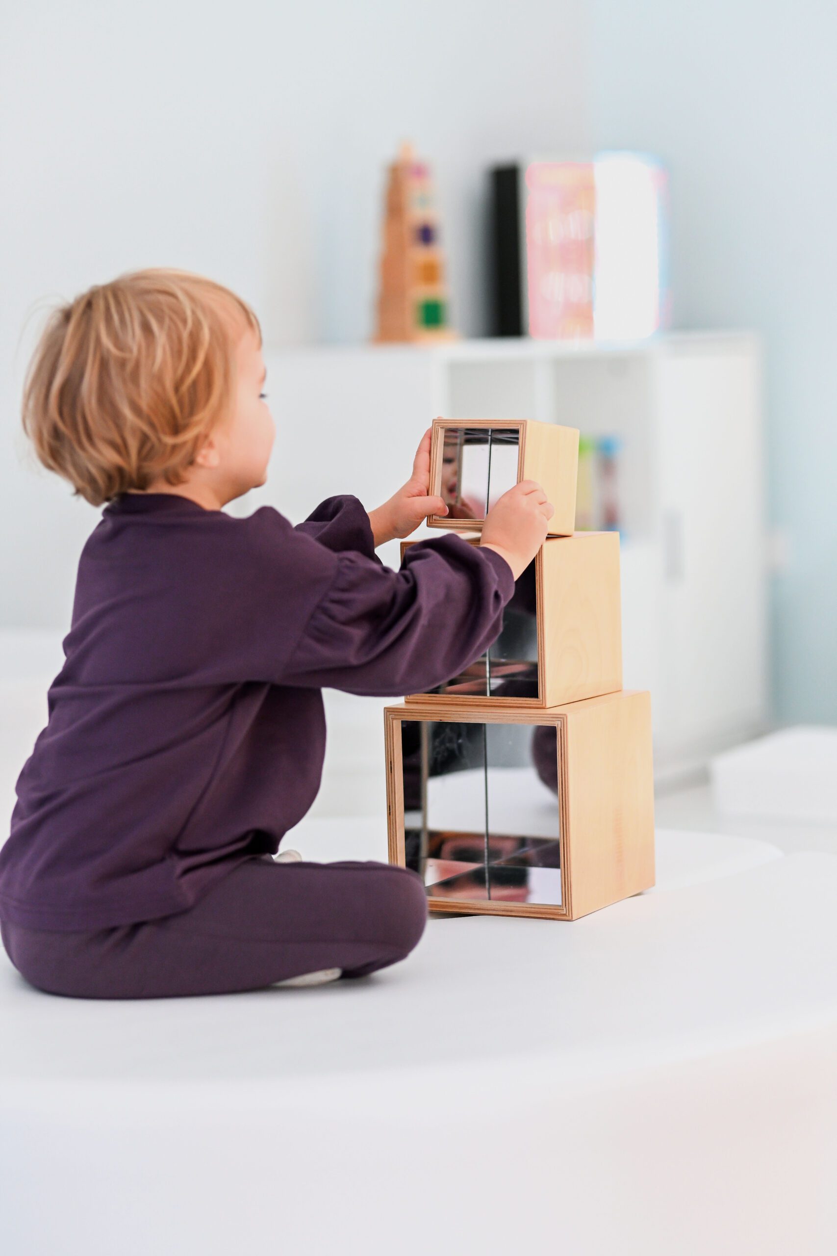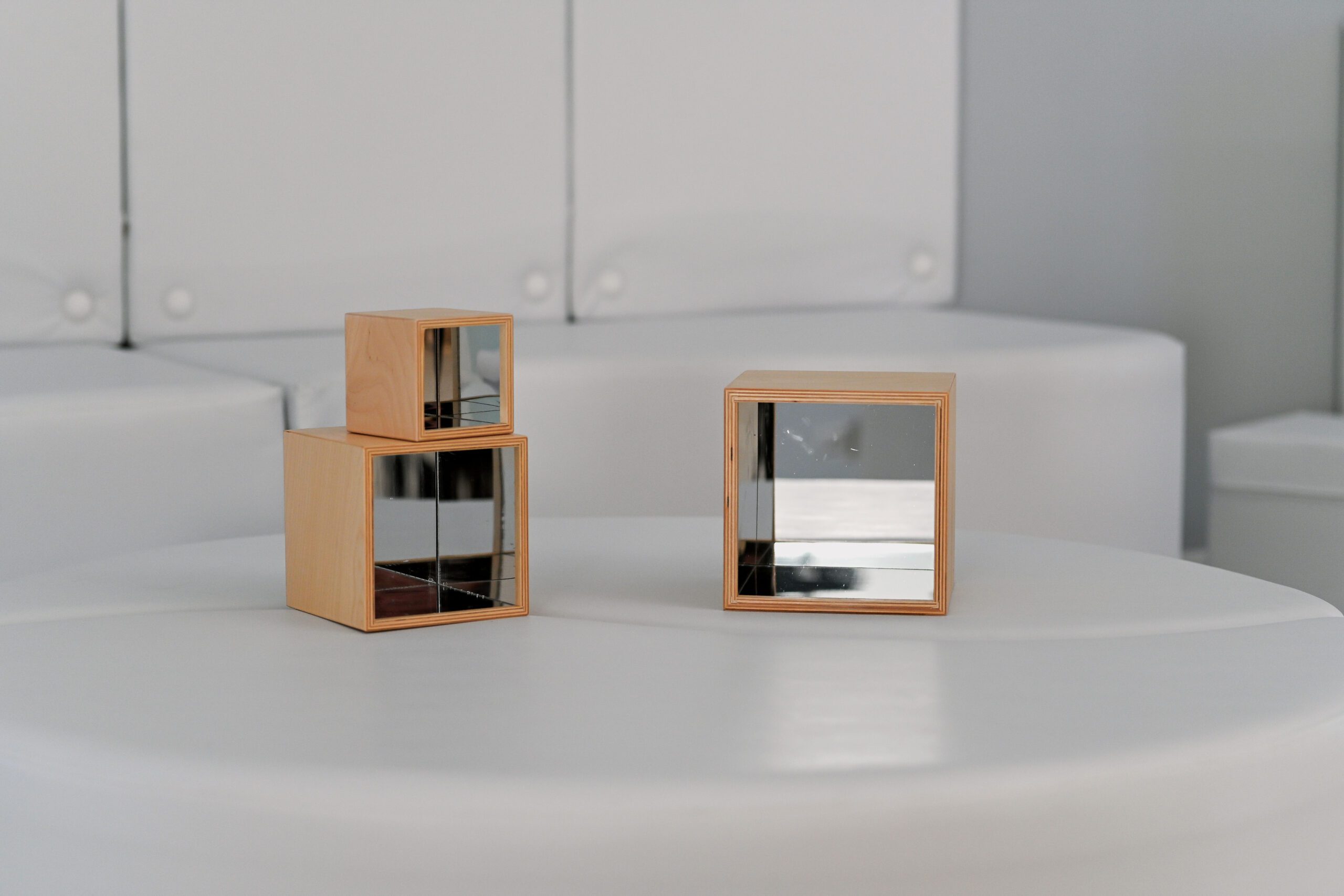 Veidrodžių dėžutės, pagamintos iš faneros ir akrilo. Įmontuoti veidrodžiai leidžia gauti skirtingas perspektyvas, todėl veidrodyje atspindėta erdvė tampa dar įdomesnė. Ant veidrodinių paviršių galite išdėstyti spalvingus daiktus, šviesas ir žaisti su atspindžiais, spalvomis ir šviesa.