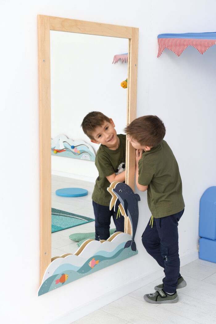 Vaikams saugus veidrodis. Veidrodis padengtas specialia plėvele, kuri neleidžia jam sudužti į smulkius gabalėlius.