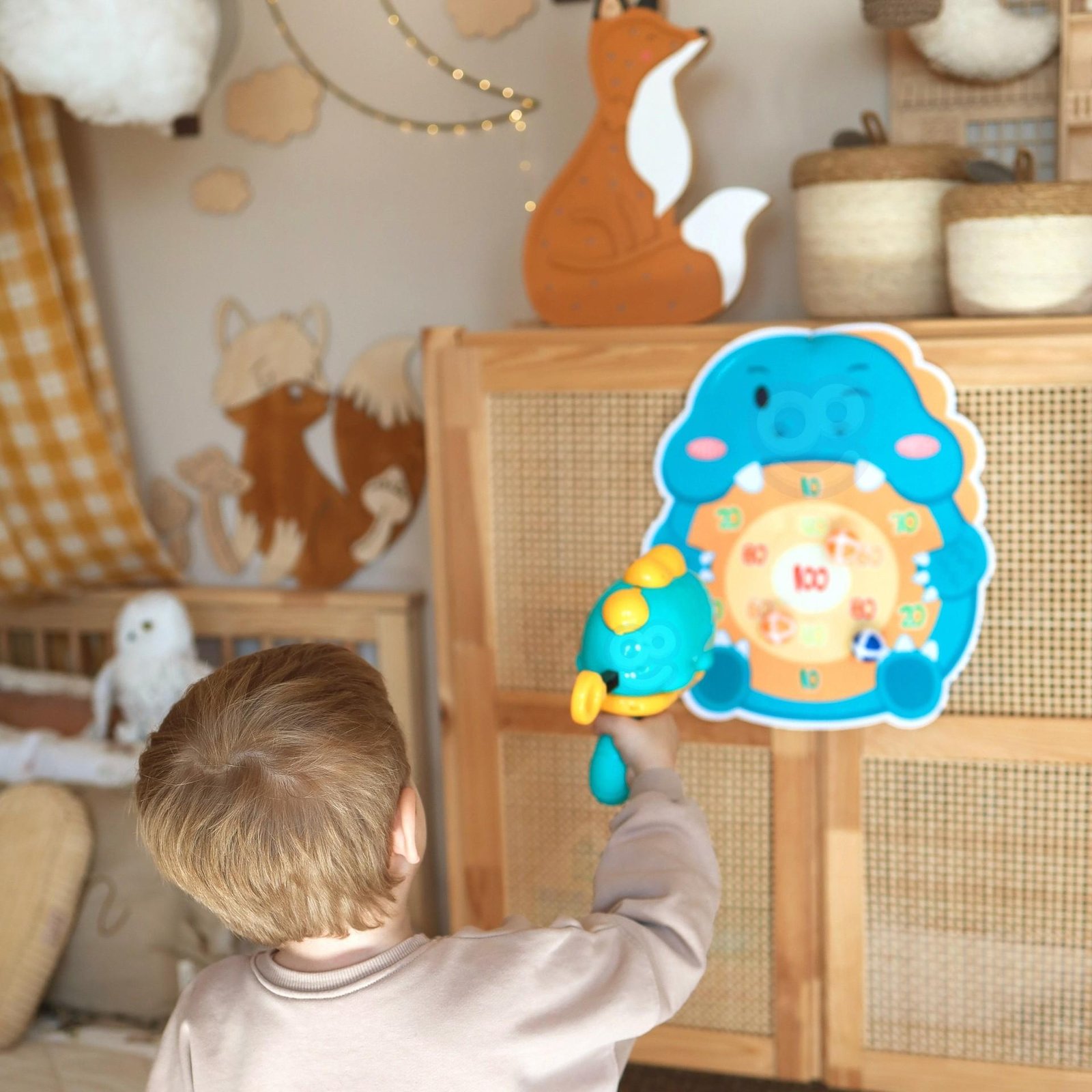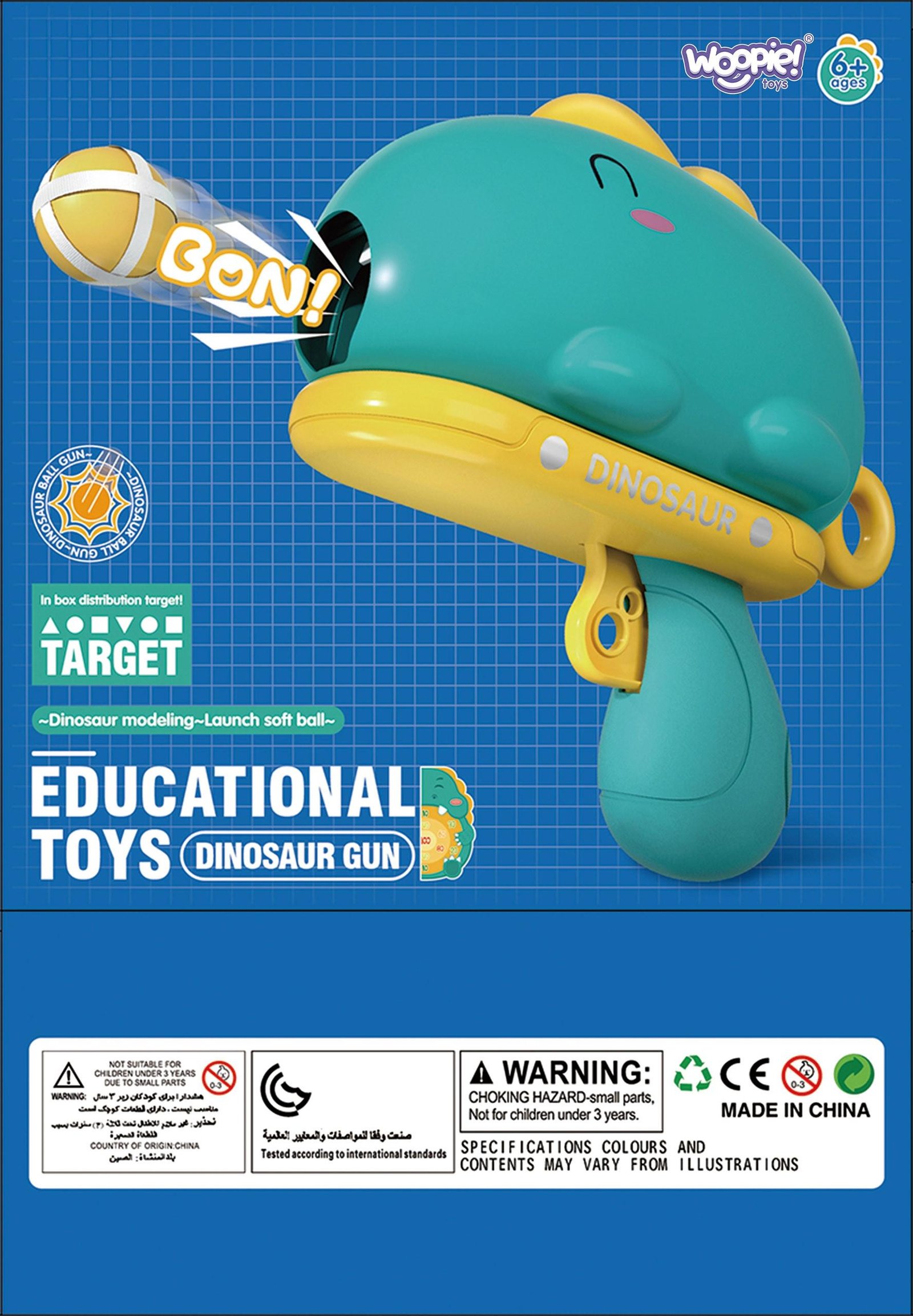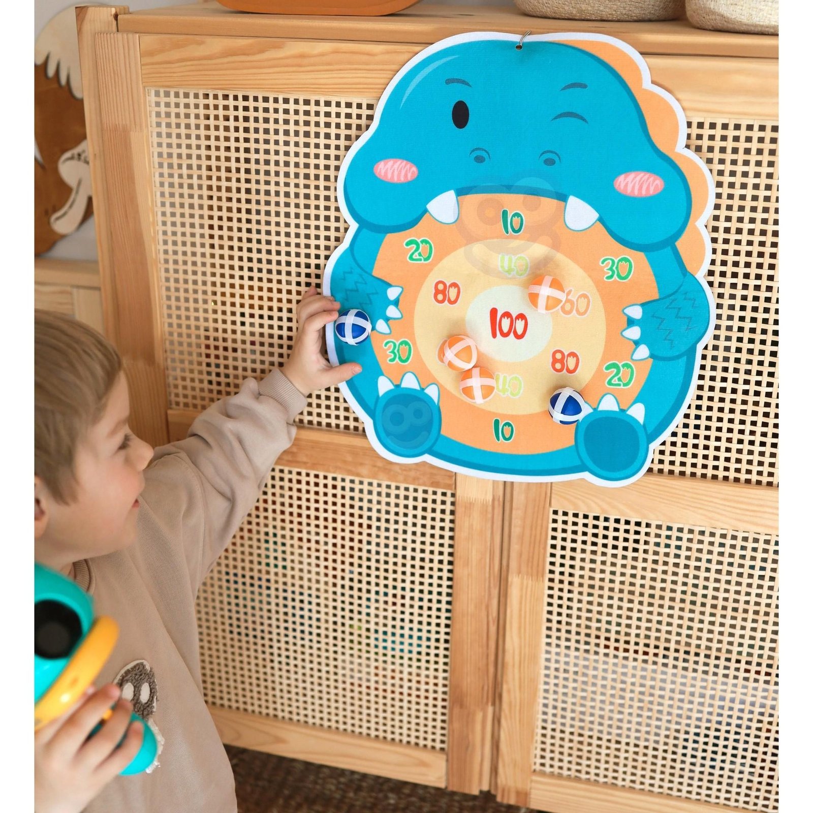 Rinkinį sudaro šautuvas ir taikinio lenta su kabliu bei 6 spalvingi velkro kamuoliukai. Lavina smulkiąją motoriką, koordinaciją ir skatina konkurenciją, leidžia lavinti taiklumą.. Lengvai surenkamas.