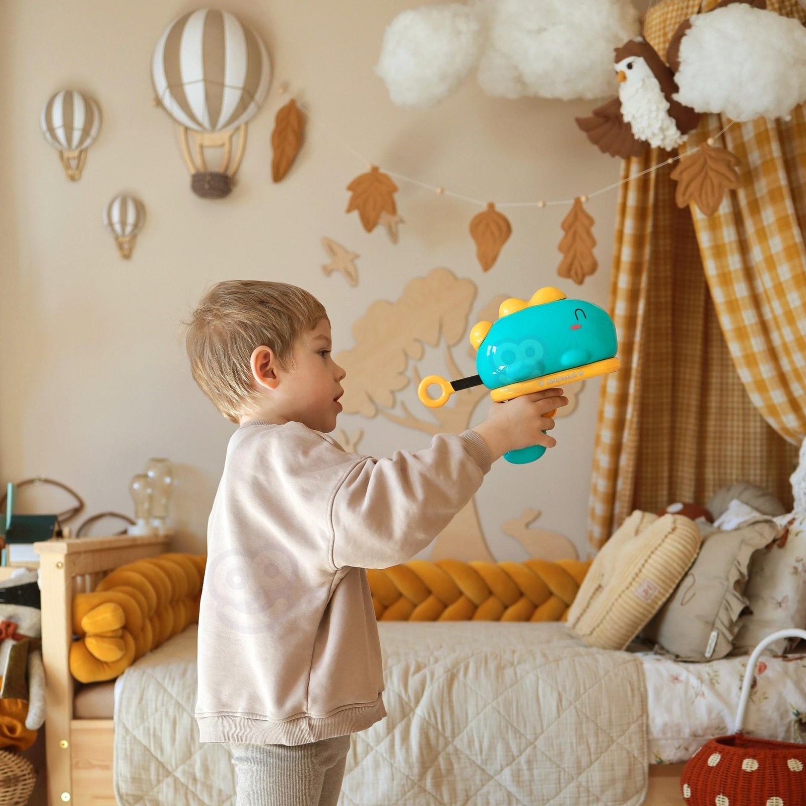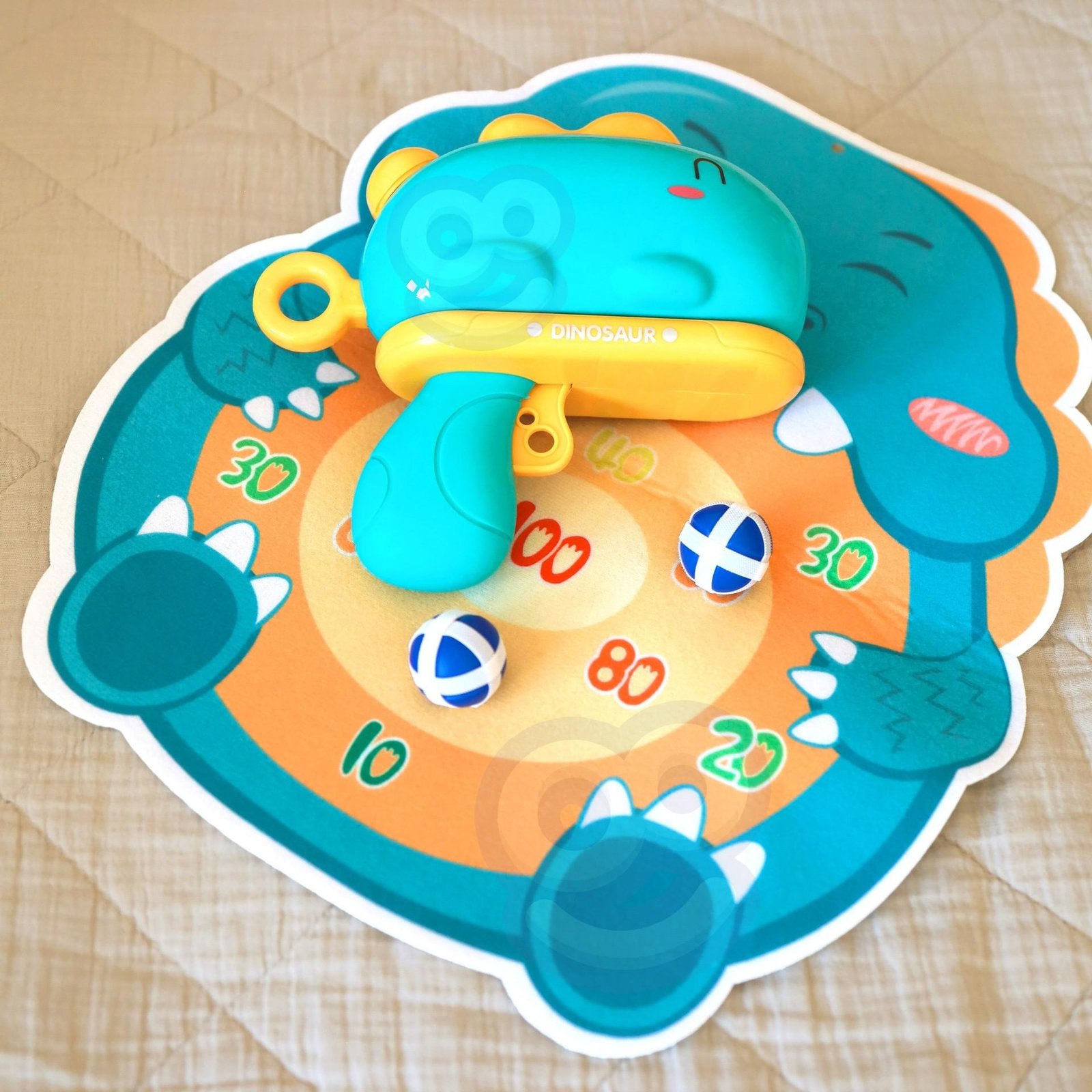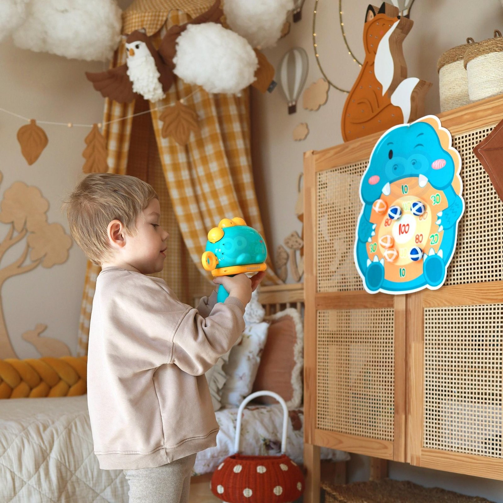 Rinkinį sudaro šautuvas ir taikinio lenta su kabliu bei 6 spalvingi velkro kamuoliukai. Lavina smulkiąją motoriką, koordinaciją ir skatina konkurenciją, leidžia lavinti taiklumą.. Lengvai surenkamas.