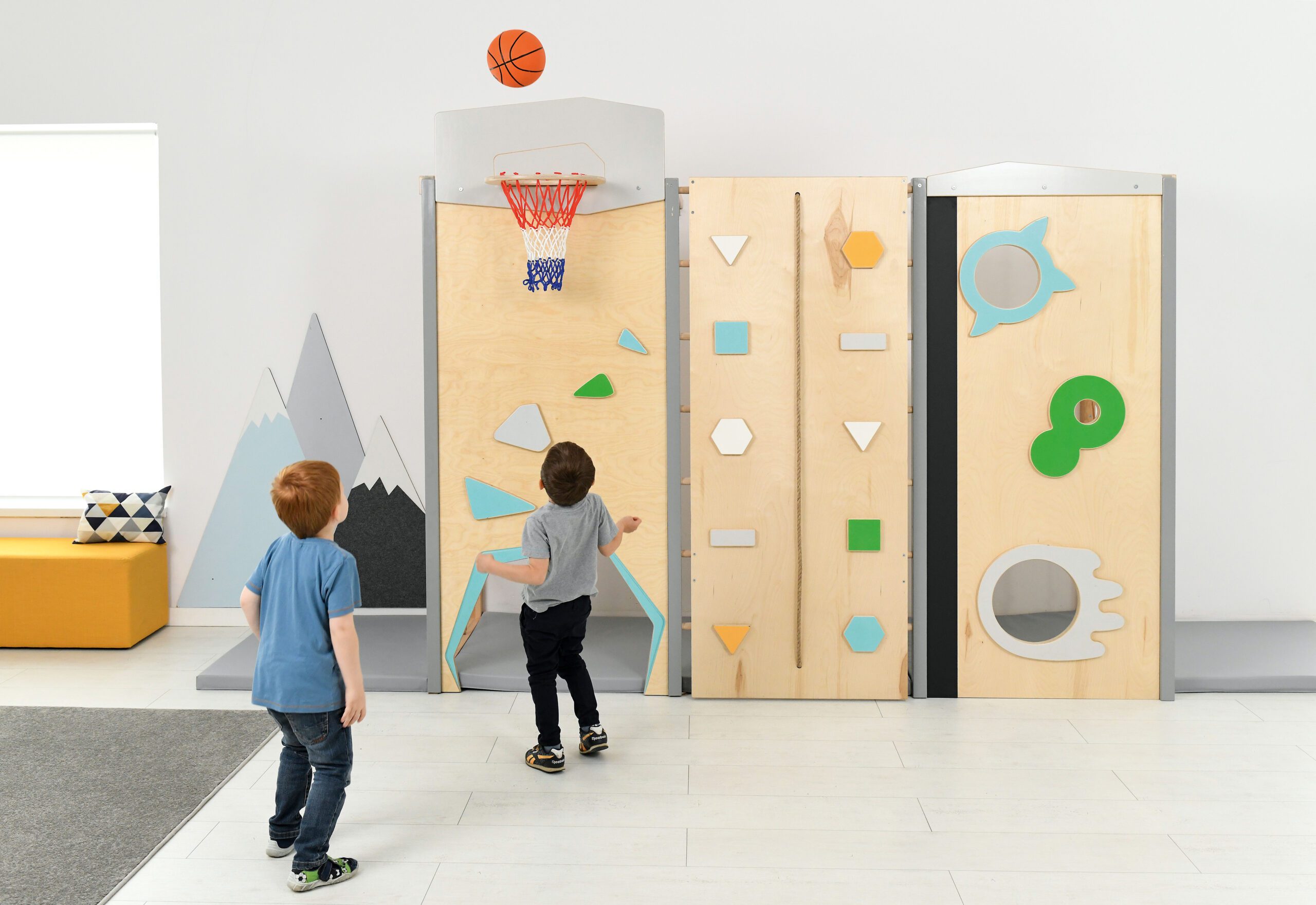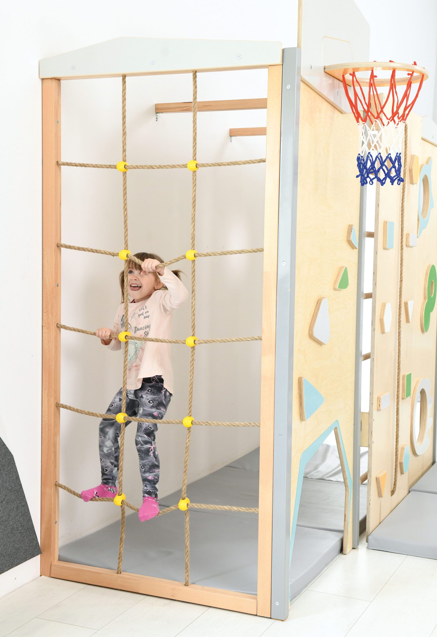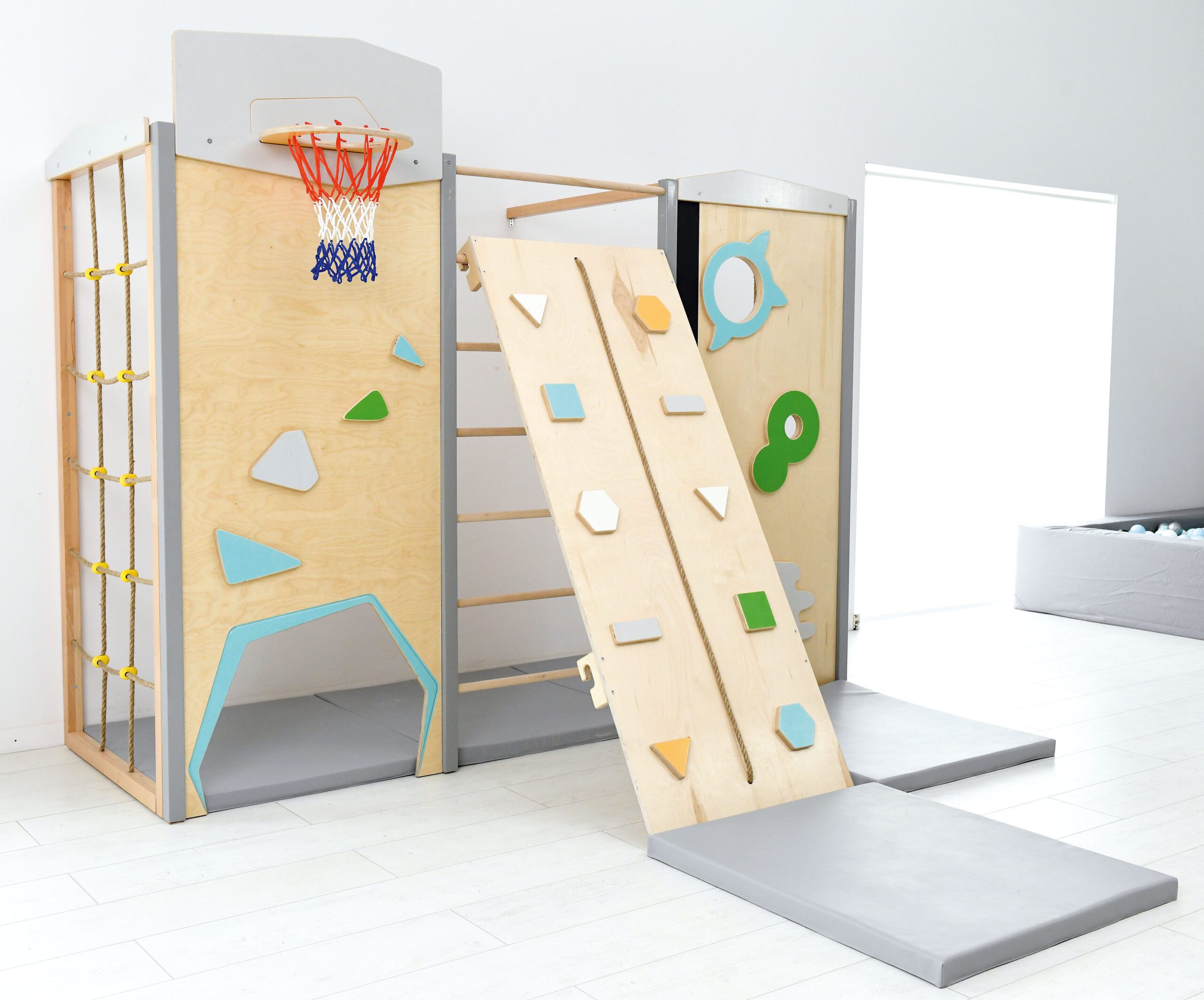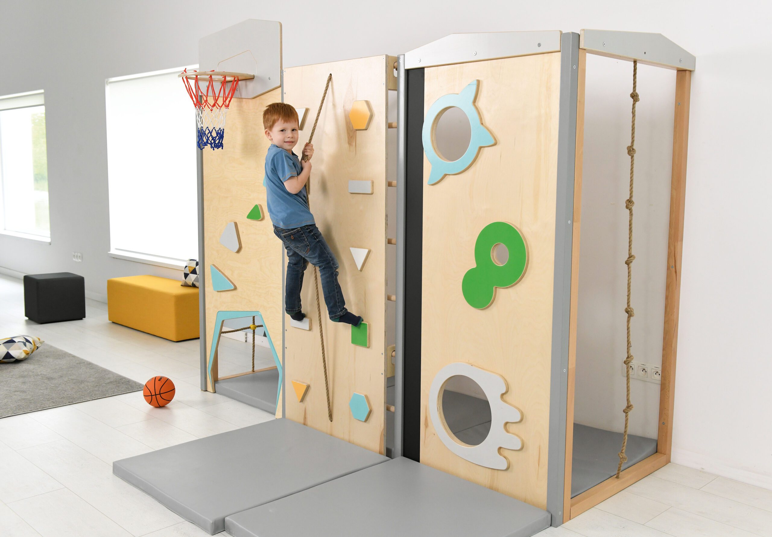 Kampelis, kuris dėl savo gausių pramogų suteiks mažiausiems daug džiaugsmo ir paskatins juos imtis sportinių iššūkių. Vaikai čia ras laipioti skirtą virvę, tinklą ir laipioti skirtą sieną su kopėčių kabliais (kurie leidžia reguliuoti sienos kampą pagal jų poreikius), virvę ir spalvingas geometrinių formų rankenas, kopėčias, sienoje esančias skylutes kamuoliukams mesti ir krepšinio lanką. Visa tai yra apsaugota pilkos spalvos čiužiniais. Kampelis yra dekoruotas švelniomis spalvomis, vyrauja pilka, todėl puikiai tinka bet kokiam interjerui. Komplektą sudaro 5 putų čiužiniai, padengti patvariu pilku PVC audiniu (aukštis 5 cm). Kampas pagamintas iš faneros ir medžio, pritvirtintas prie sienos ir grindų.