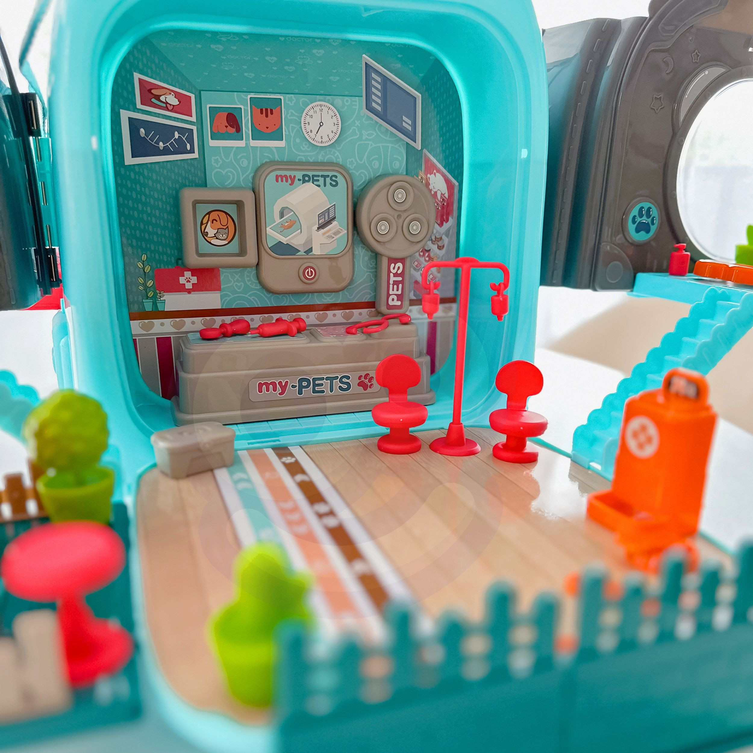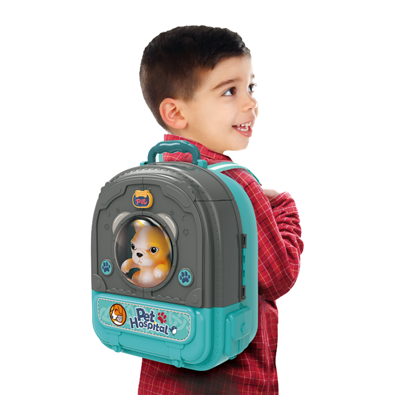 - – 3-in-1 toy – backpack, animal hospital with garden, dog grooming area