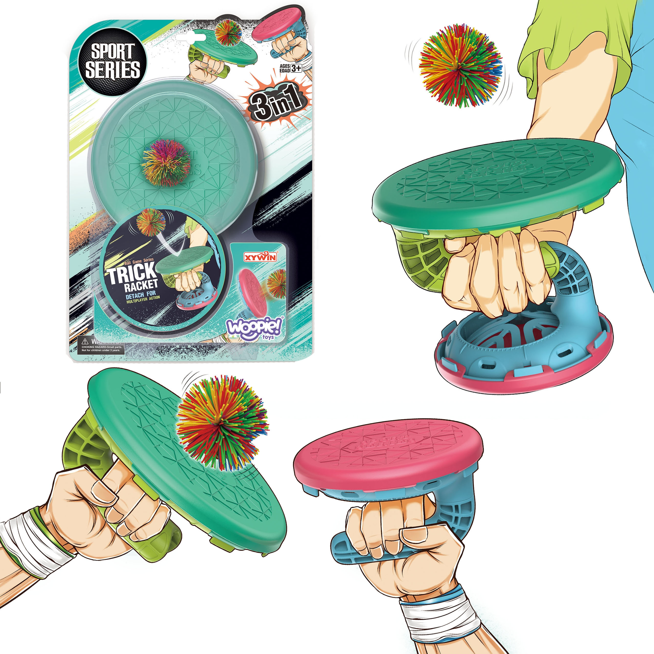 - 3-in-1 dizainas, raketė naudojama gaudyti, smūgiuoti ir atlikti triukus su kamuoliu!
