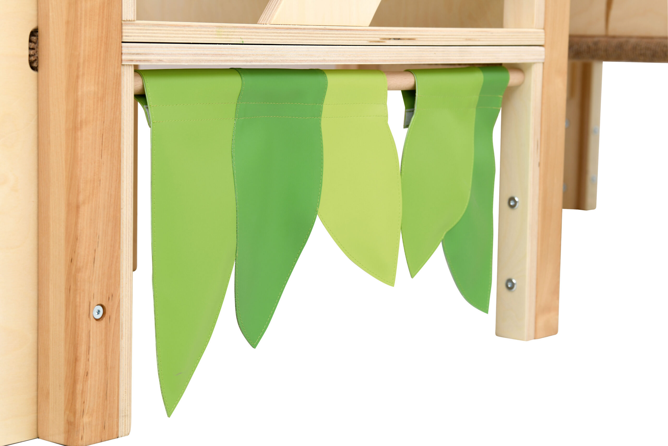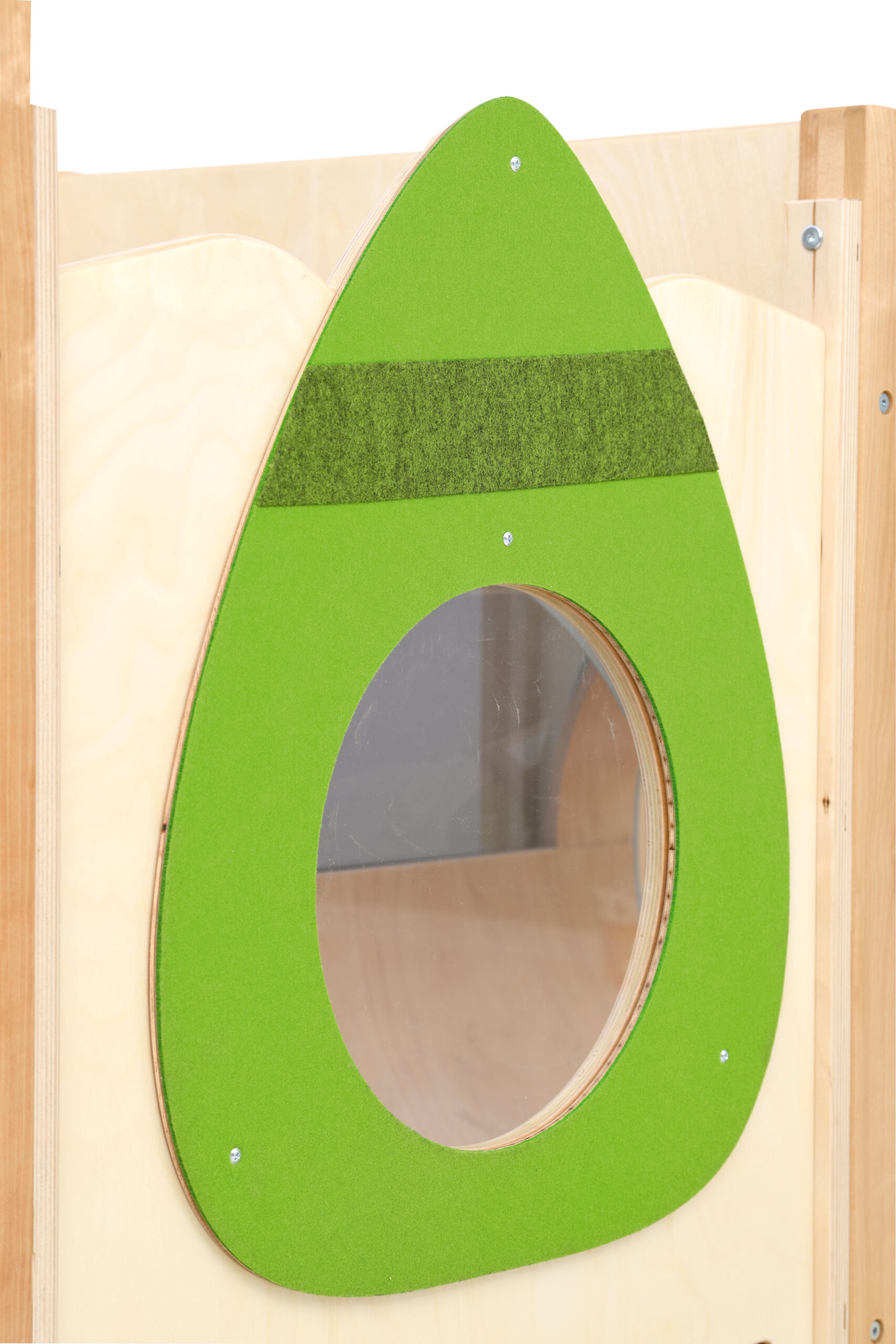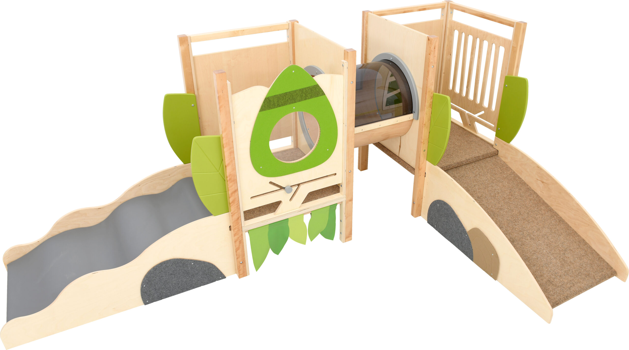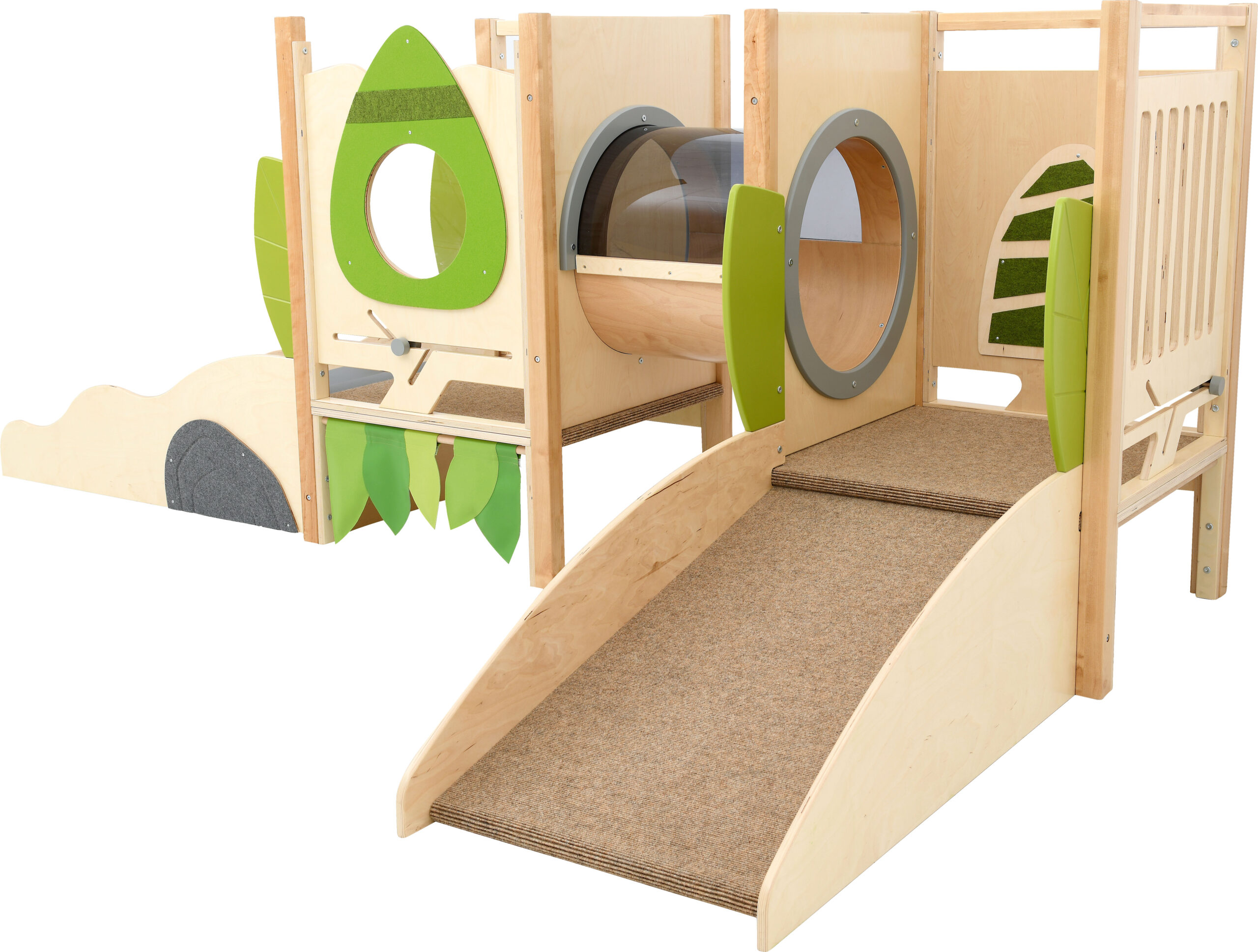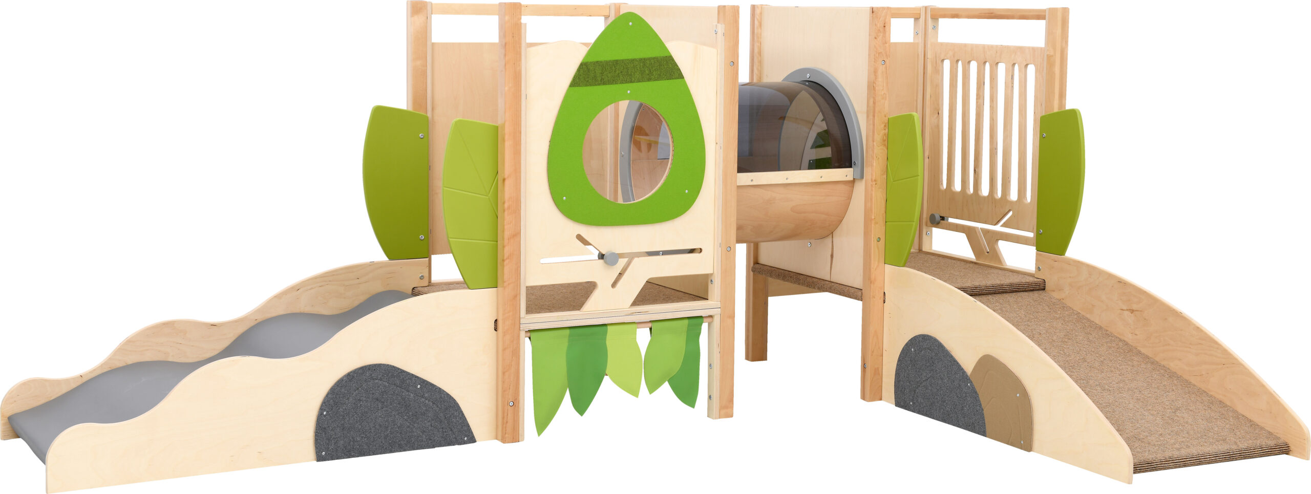 Natūraliomis spalvomis nudažytas gėlių motyvais dekoruotas žaidimų kampelis. Pagamintas iš faneros, laminuotos medžio drožlių plokštės ir medžio. Kampelyje taip pat įrengtas čiužinys-vanduo, judantis labirintas, langas ir platformos, padengtos priderintu kilimu. – Mat. 324 x 187 x 125 cm – tunelio skersmuo. 50 cm ir 57 cm ilgio – bangų modulis mat. 66 x 43 x 122 cm – modulis su pritvirtintu kilimu mat. 66 x 43 x 110 cm – platformos mat. 76 x 76 cm – platforma