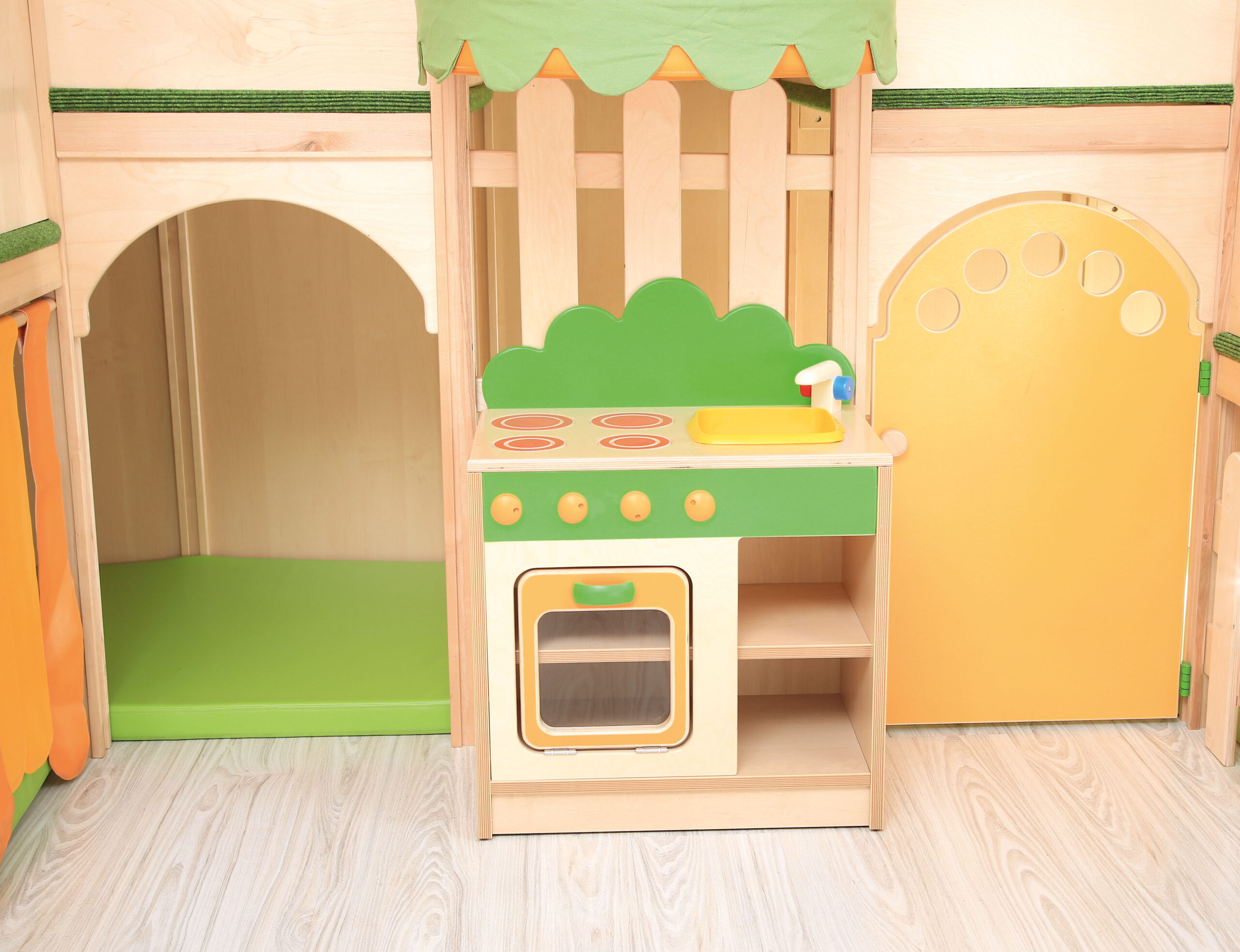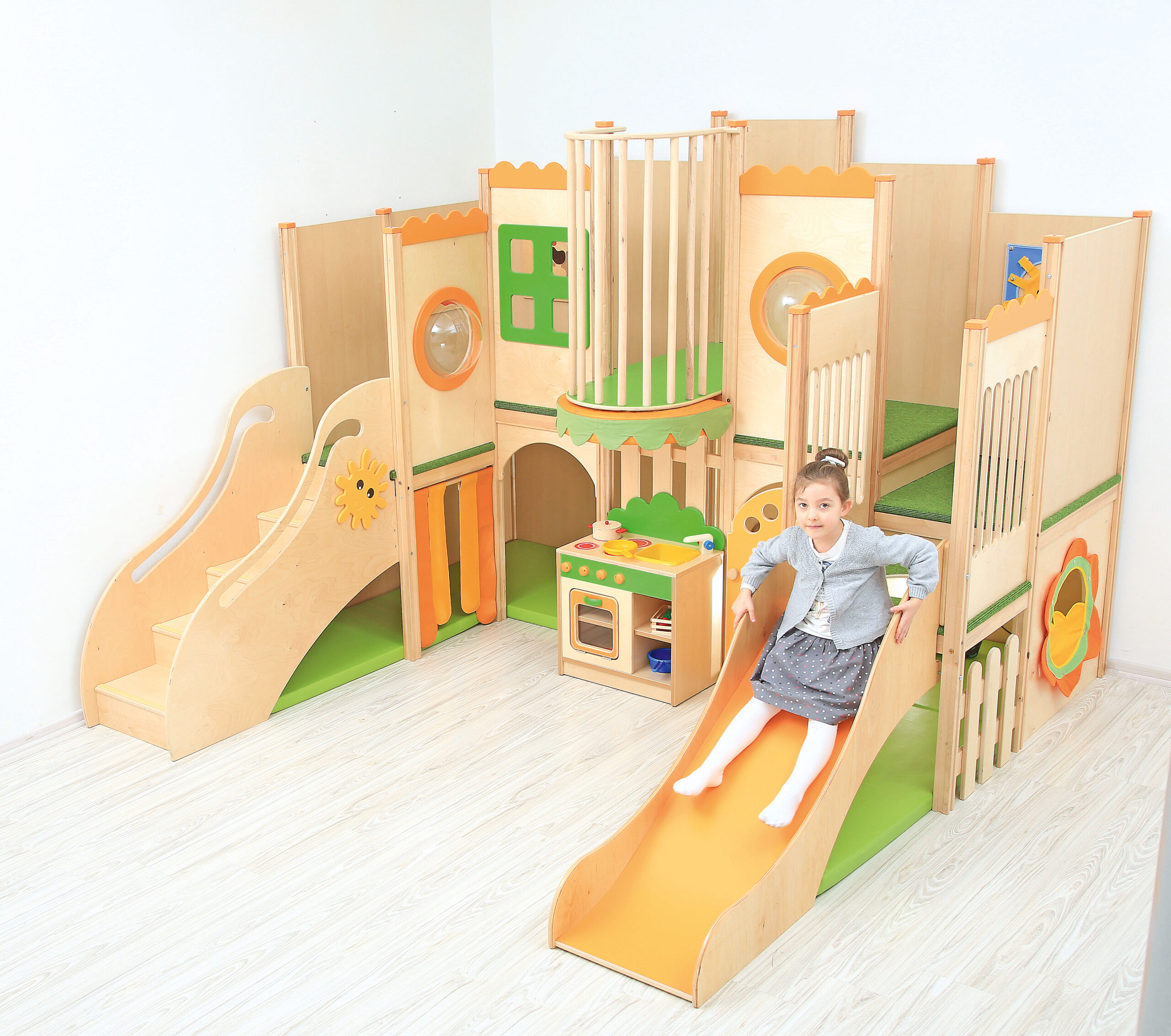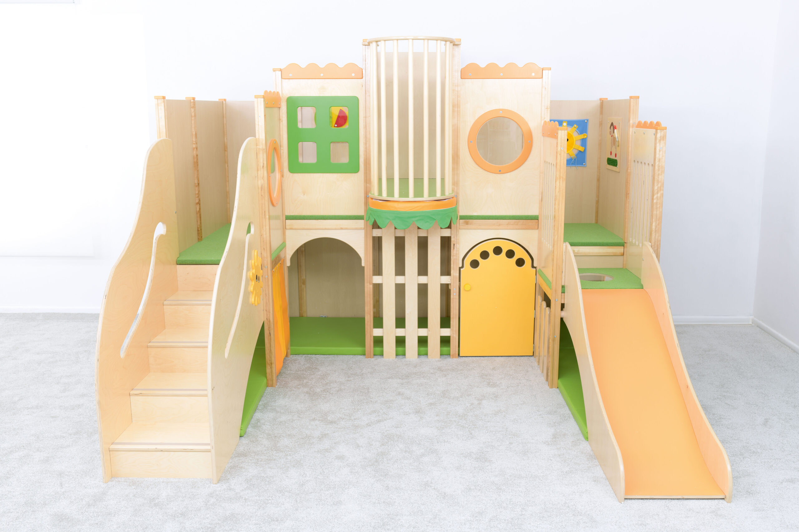 Pagamintas iš faneros, MDF spalvotos plokštės, laminuotos medžio drožlių plokštės ir medžio, jame yra čiuožykla, laiptai, čiužinukai. Platformos padengtos neslidžiu priderintu kilimu. Įvairios manipuliacinės plokštės pritvirtintos prie sienos. Apatinėje dalyje yra keli įėjimai, o paviršius išklotas čiužiniais.