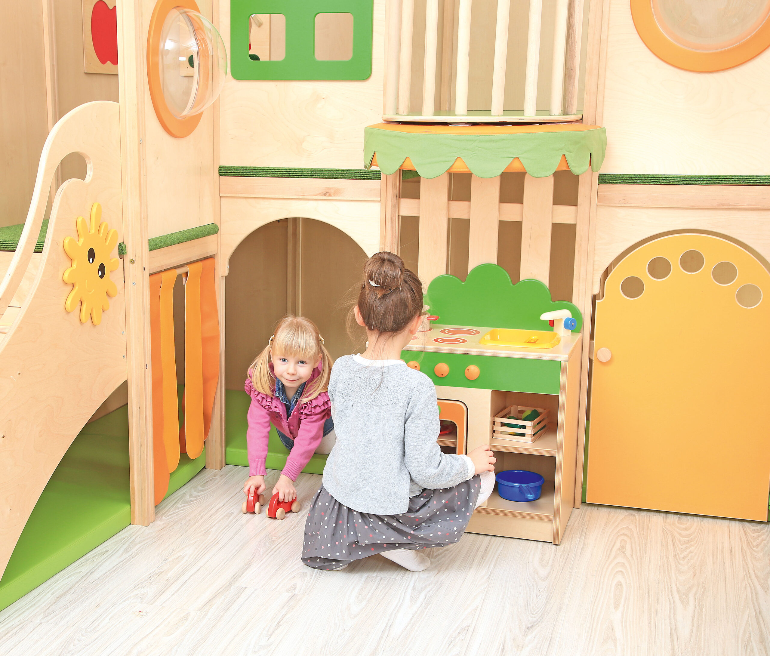 Dideliame žaidimų kampelyje įrengta daugybė atrakcionų, kurie sudomina vaikus ir kartu suteikia puikią pramogą. Jie gali čiuožinėti, naudotis manipuliacinėmis plokštėmis, žaisti virtuvės kampelyje arba pasislėpti viduryje ir žaisti ant minkštų čiužinių.