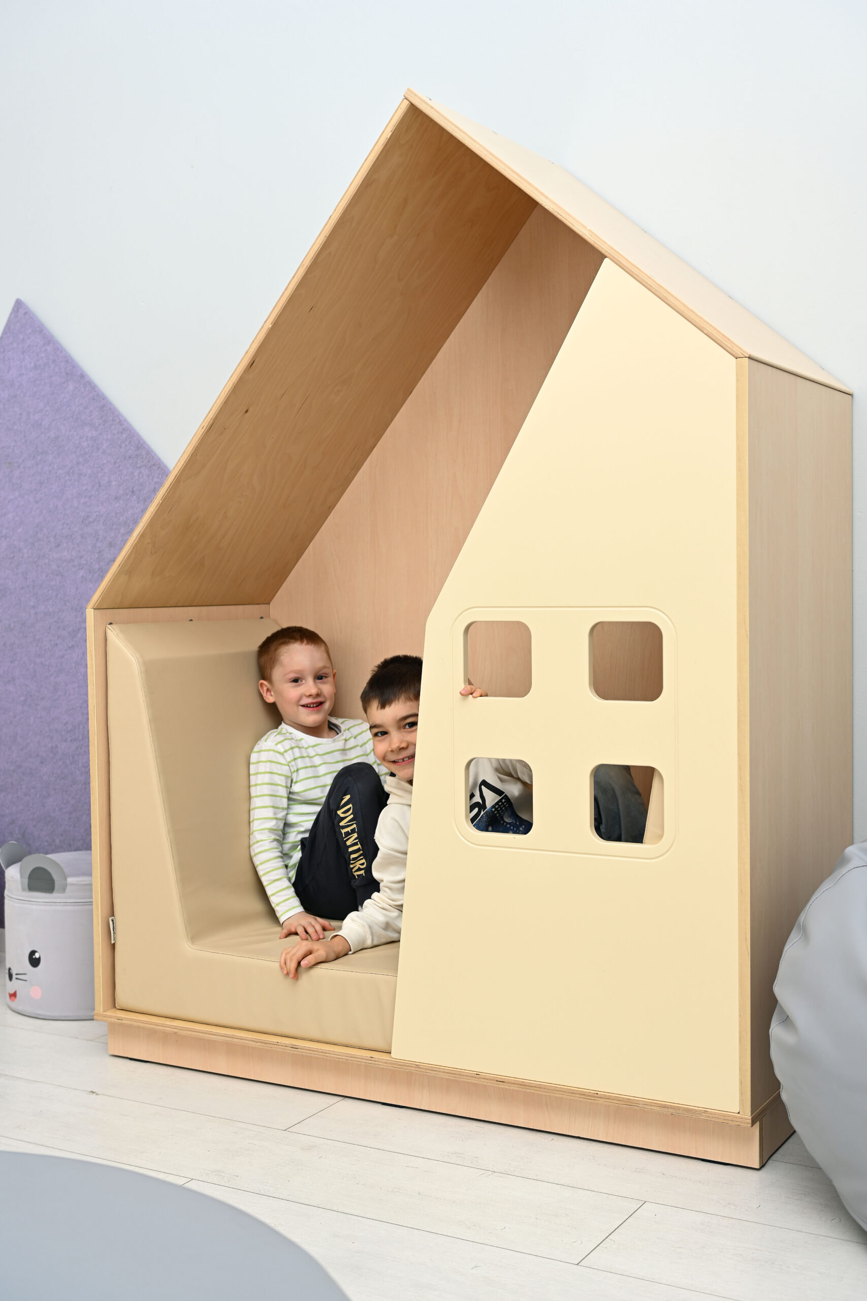 Spinta – namo formos slėptuvė su aplikacija – siena su langu. Vaikai gali patogiai įsitaisyti viduje, atsipalaiduoti ir nusiraminti. Pagaminta iš 18 mm storio baltos laminuotos plokštės ir 18 mm storio lakuotos faneros, porolono čiužinukai aptraukti patvariu PVC audiniu, kurį lengva palaikyti švarų.