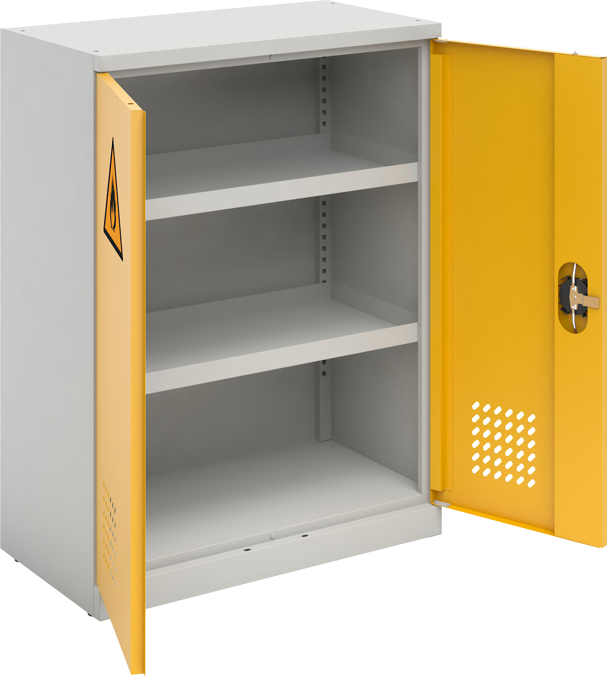 Žema cheminė spinta su 2 perstatomomis cinkuotos skardos lentynomis, skirta cheminių reagentų ir degių medžiagų laikymui. Pilnos durys su sutvirtinančiu profiliu, išoriniais vyriais ir 3 taškų užrakto sistema. Oro angos durelėse užtikrina oro cirkuliaciją. Lentynos su apsauginiais kraštais, neleidžiančiais pavojingiems skysčiams išsilieti.