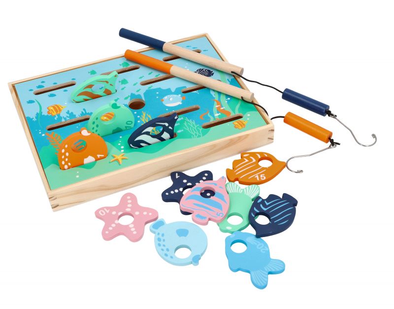Žvejybos žaidimas 3+ metų vaikams. Žaidime yra 12 jūros gyvūnų, 2 meškerės ir medinis stovas.